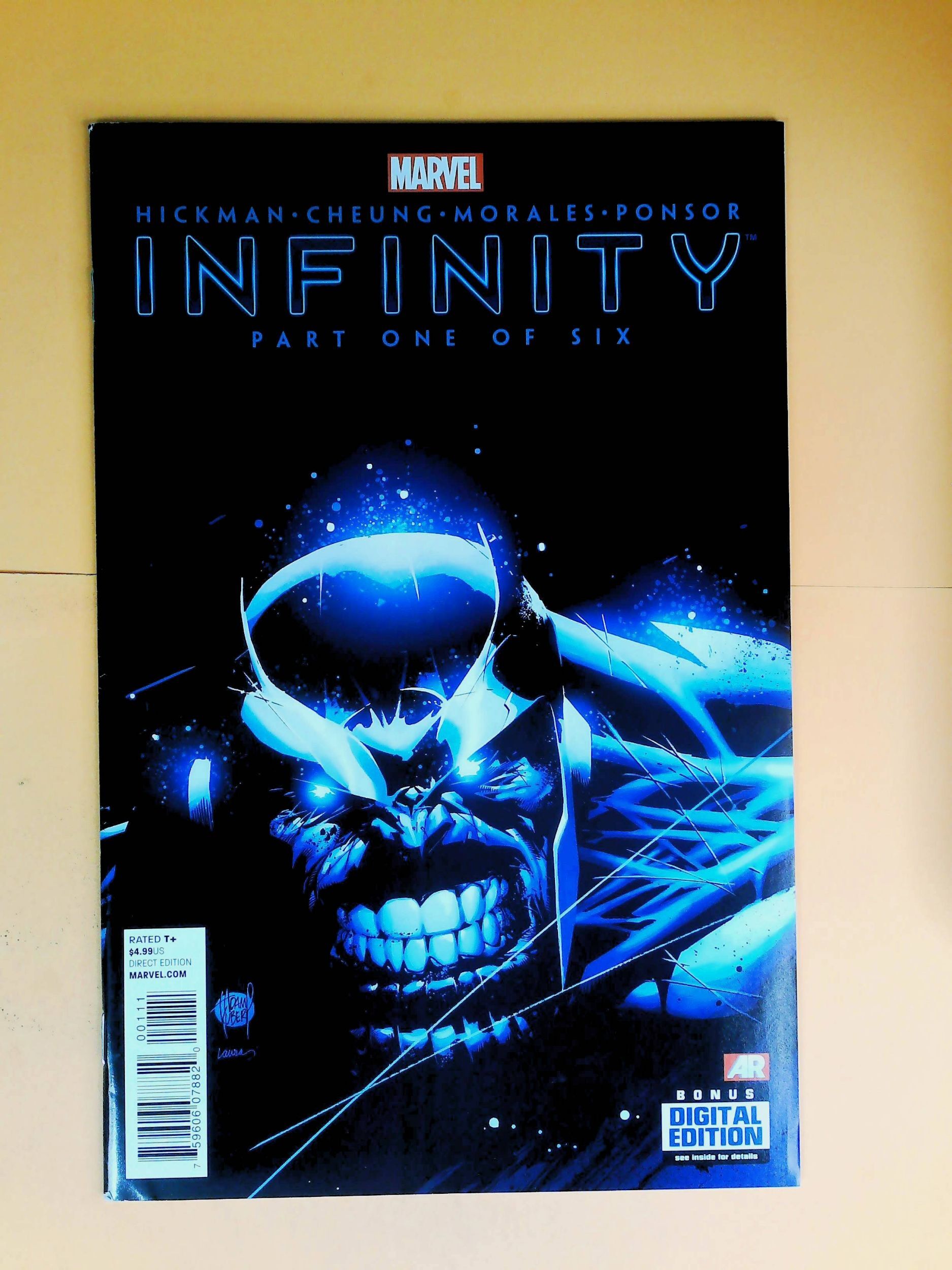 First Printing (W) Jonathan Hickman (A) Jim Cheung (CA) Adam Kubert The oversized kickoff to the year's most anticipate Blockbuster summer event, chaning the way you view the Marvel Universe! The outbreak of war on two fronts: Earth and Space, with our heroes torn between them. The world-shattering return of Thanos! Includes material from FREE COMIC BOOK DAY: INFINITY" Cover price $4.99.Seller Information