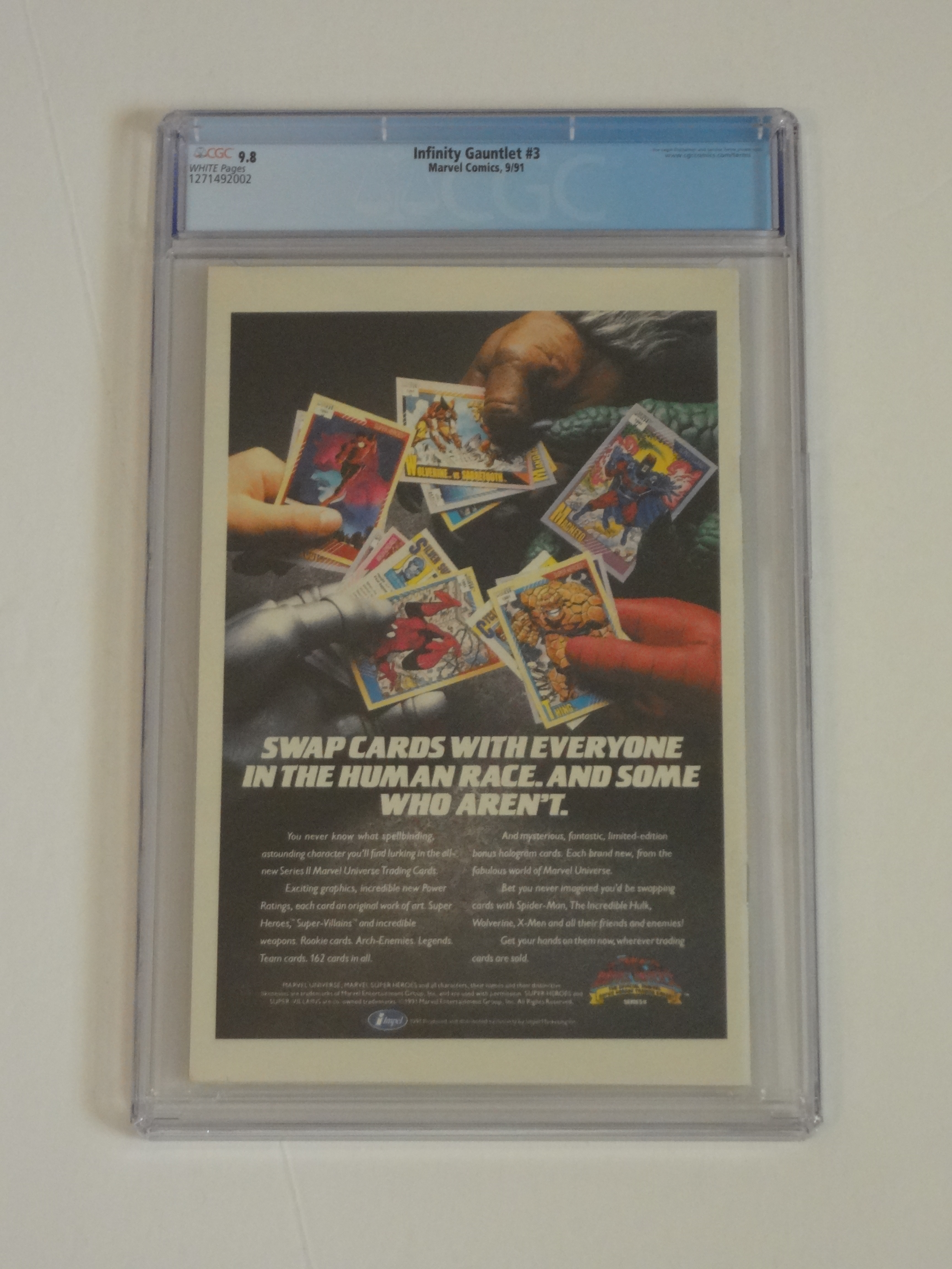 Direct edition of Infinity Gauntlet #3, part of a 6-issue mini-series. The cover was done by George Perez. This issue features the Avengers, as well as the 1st appearance of Terraxia. Numerous cameo appearances are also included.It is graded a 9.8 by CGC and is stored in a cool, dry, smoke/pet-free environment. It is also placed in a polypropylene bag for extra protection against scratches.