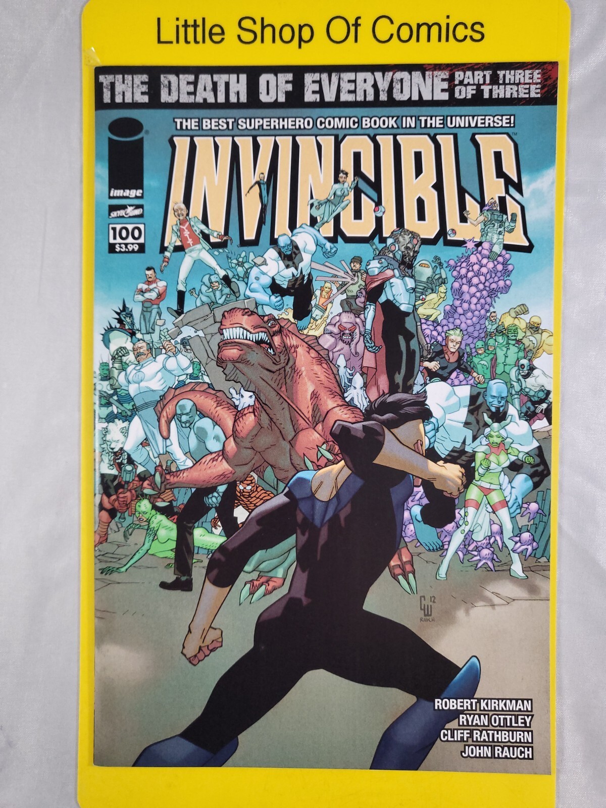 Grade: 9.0 Very Fine/Near MintThis listing is for one (1) copy of Invincible #100 Cory Walker Variant Cover B SPECIAL NOTE: This book is in VFNM or better condition. Missing a piece along the spine. ALL COMICS ARE BAGGED AND BOARDEDPLEASE READ Paypal users must be verified, with a Confirmed Shipping Address.We package comics in a T-FOLDER, we take the extra step to protect your comic by taping the book down in the T-folder to prevent movement.Local pick-up is on Thursdays from 11 am to 4 pm. Thank you for looking at our listing, this is how we make a living if you have any issues with your item(s) please get in touch with us first so we can help you with resolve that issue. Again, thank you for checking us out.