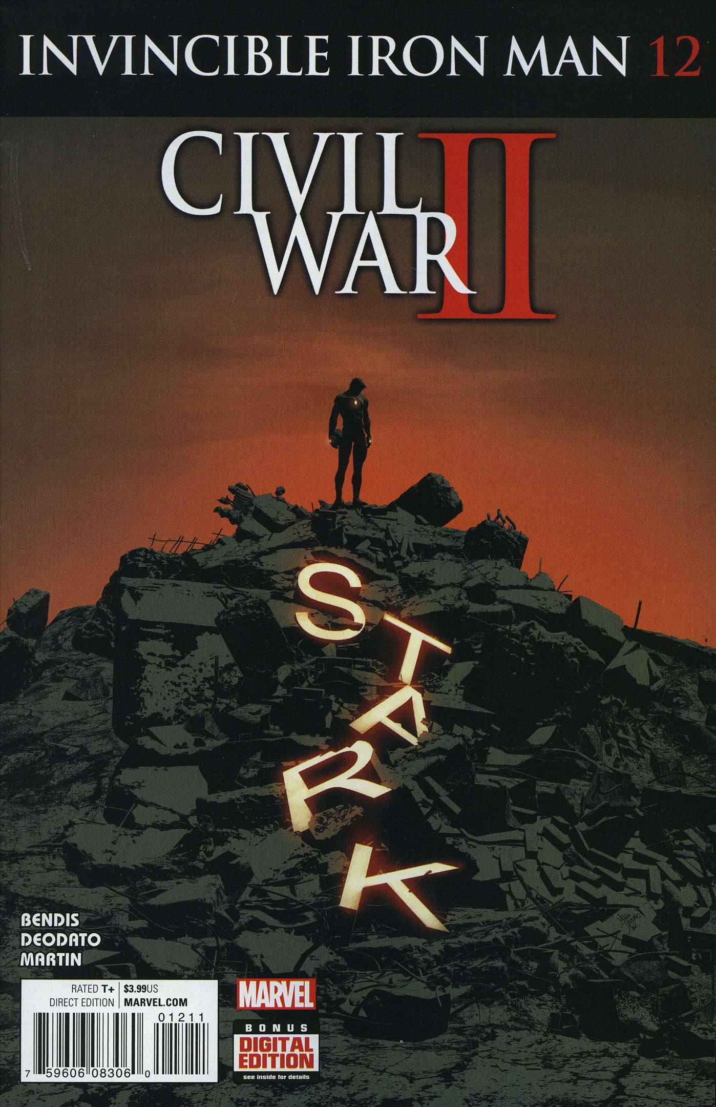 Item: Invincible Iron Man (2nd Series) #12 | Publisher: Marvel | Cover Date: October 2016 | Writer: Brian Michael Bendis | Artist: Mike Deodato | Cover Artist: Mike Deodato | Appearances: Doctor Doom, FDNY. D.H.I.E.L.D., Maria Hill, Stark Industries, Friday, Iron Man, Mr. Lynch, Mary Jane Watson, Riri Williams | Notes: Civil War II tie-in | With Economy shipping, each additional comic ships for just 50 cents more to customers in the USA. This listing contains a stock photo and information from ComicBase™ and © Human Computing. The stock photo is for reference only. If you would like to see a photo of the actual item, please message us prior to purchasing.Seller Information
