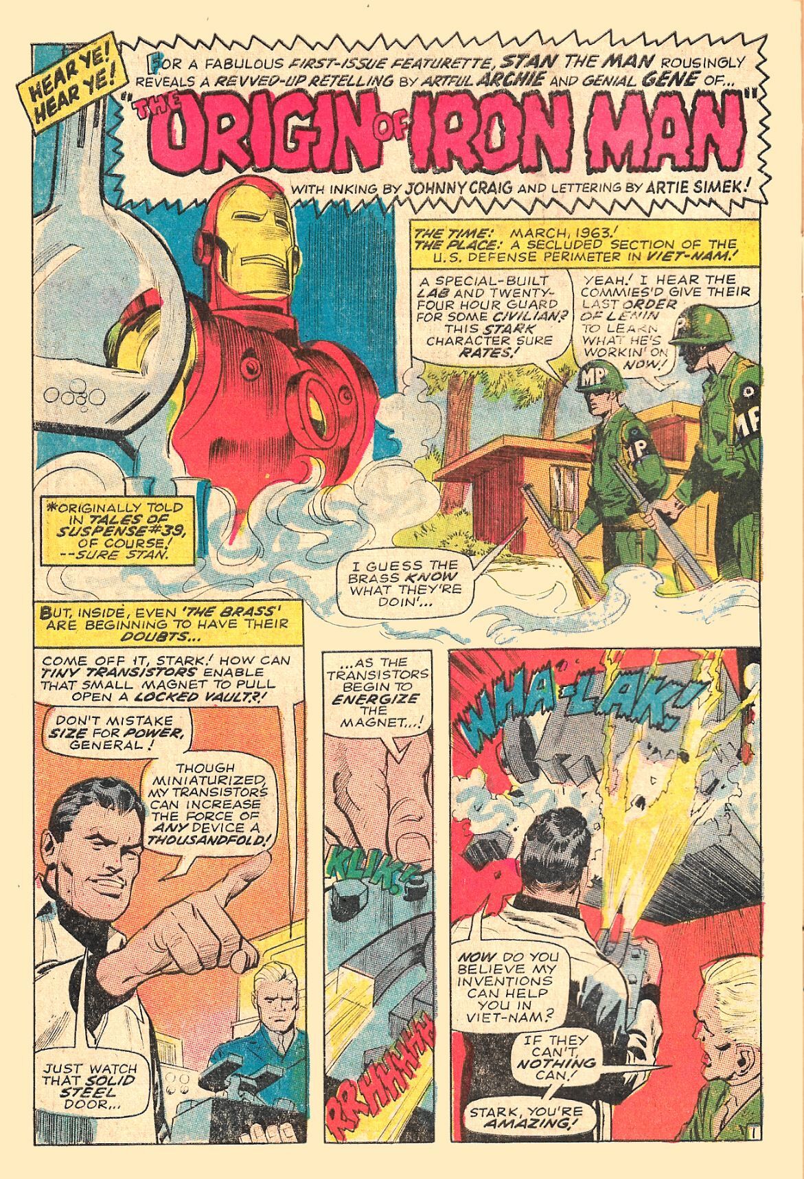 There is also a great 3-page recounting of IRON MAN's origin that first appeared in the aforementioned TALES OF SUSPENSE #39, with art by Johnny Craig and Gene Colan!