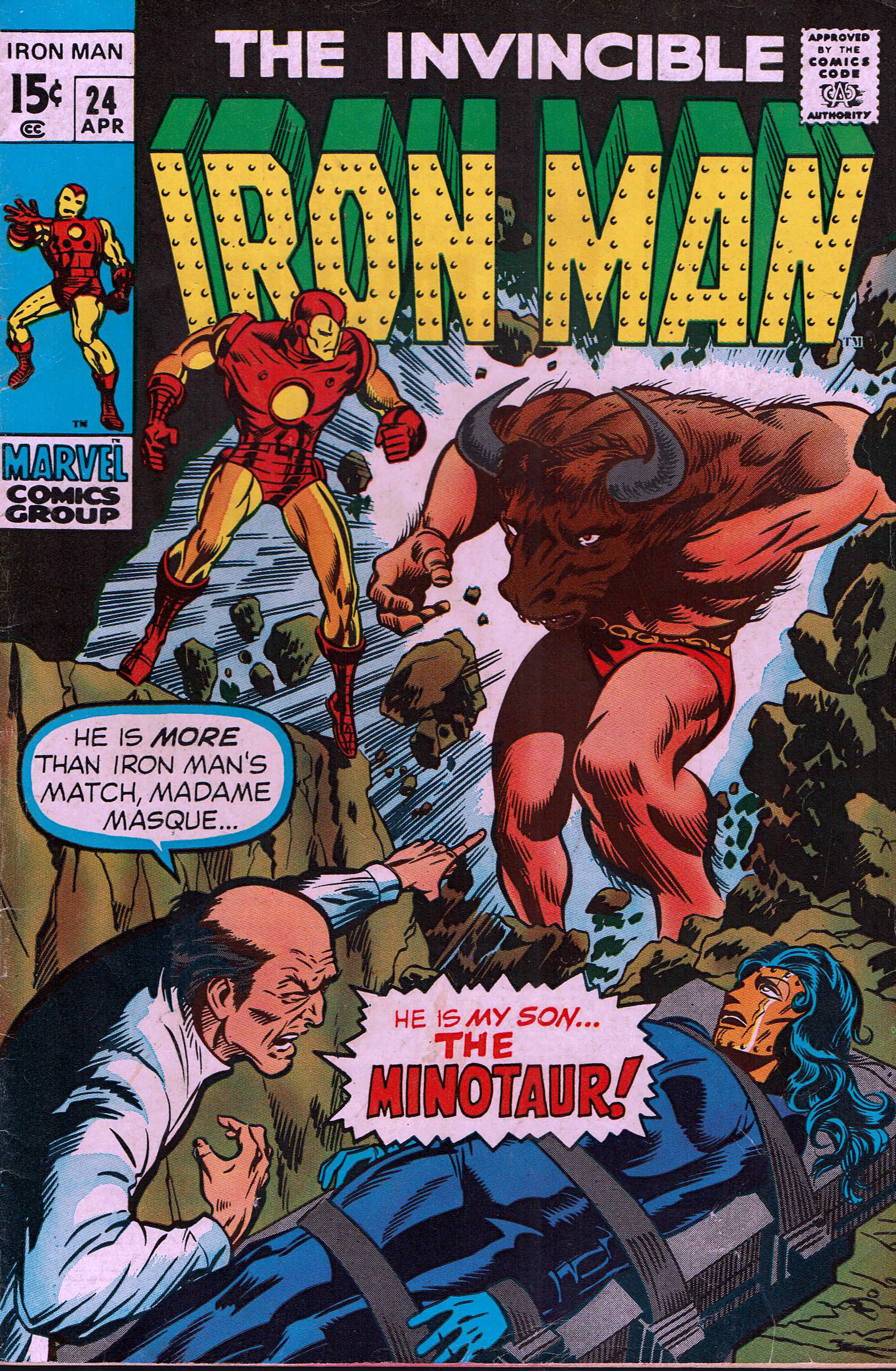"my son...The minotaur!" story by archie goodwin. Art by johnny craig and george tuska. Cover by marie severin. Following the events of iron man 19, madame masque (aka whitney frost) washed up in a grotto on an aegean sea island. Now she is the unsuspecting prisoner of the twisted dr. Vryolak and the minotaur! The duo of iron man and jasper sitwell is on the way to free her, but can they rescue madame masque before dr. Vryolak turns her into a mate for his son? 32 pages cover price $0.15.