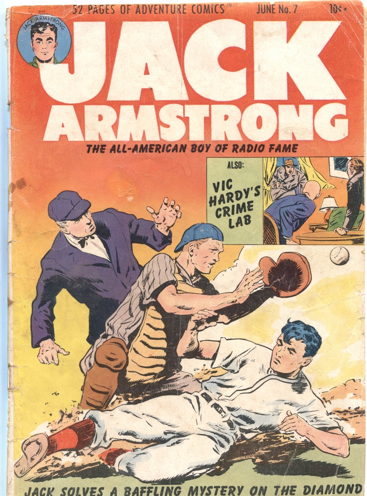 Grade: GJack armstrong #7-1948-baseball-mystery-crime-counterfiting-vic hardy crime lab-rare baseball mystery cover and story “the all-american boy of radio fame” unusual format features several stories that start in a text format and continue with comic art vic hardy’s crime lab lower grade grade: g sku: li-104-059