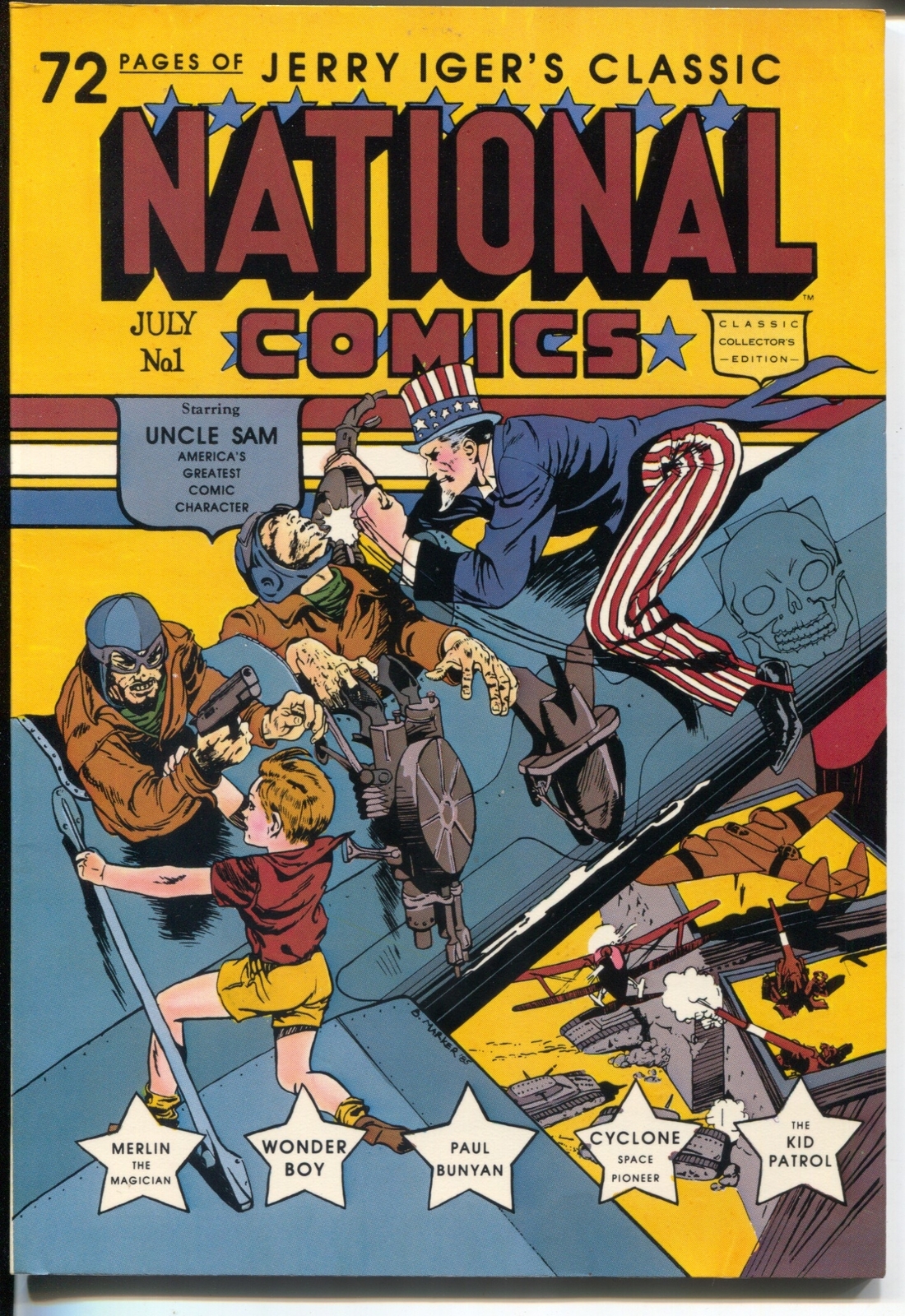 Grade: VF/NMJerry Iger's National Comics #1 1985-1st issue-reprints 1st National Comics-VF/N -First issue -Reprints the 1st issue of National Comics -Uncle Sam by Will Eisner -Wonder Boy, Cyclone, Merlin The Magician, and more -Color cover, B & W interior -Originally published by Quality Grade: VF/NM SKU: MEN19-076