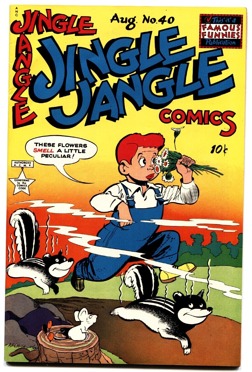 Grade: VF/NMJINGLE JANGLE COMICS #40 1949-SKUNK COVER-high grade-vf/nm Skunk cover. Outstanding art in the GEORGE CARLSON style. Eastern Color Pub file copy. Incredible gloss and spine. Historic comic book. Grade: VF/NM SKU: DHV-01-052