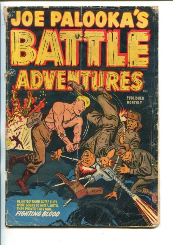 Joe palooka's battle adventures #70-1952-commies-korean war stories-good+ this issue features korean war stories and joe fighting commies on the front cover. Title: joe palooka's battle adventures #70-1952-commies-korean war stories-good+ issue: 70 grade: g sku: ctr-68-050Seller Information