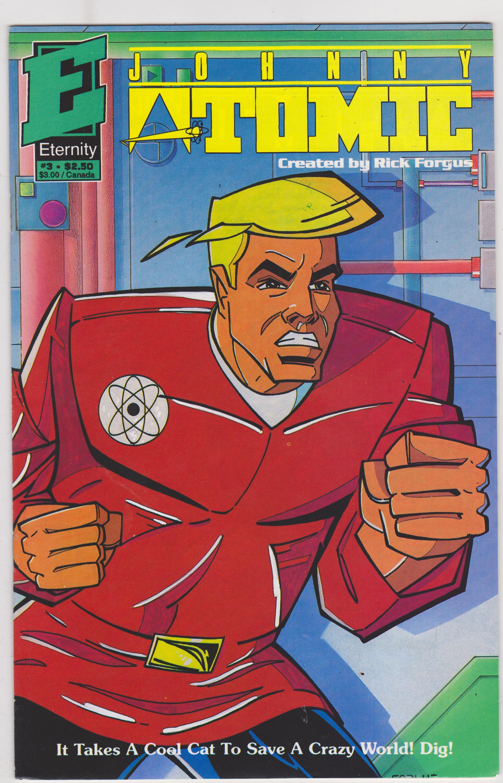 Johnny Atomic #3 by Eternity Comics copyright 1991. I have graded the comic book, using the Overstreet Grading Guide, at FINE/VERY FINE with the following defects: Light stress marks along the spine. The corners are rounded. There is light yellowing of the pages.Seller Information
