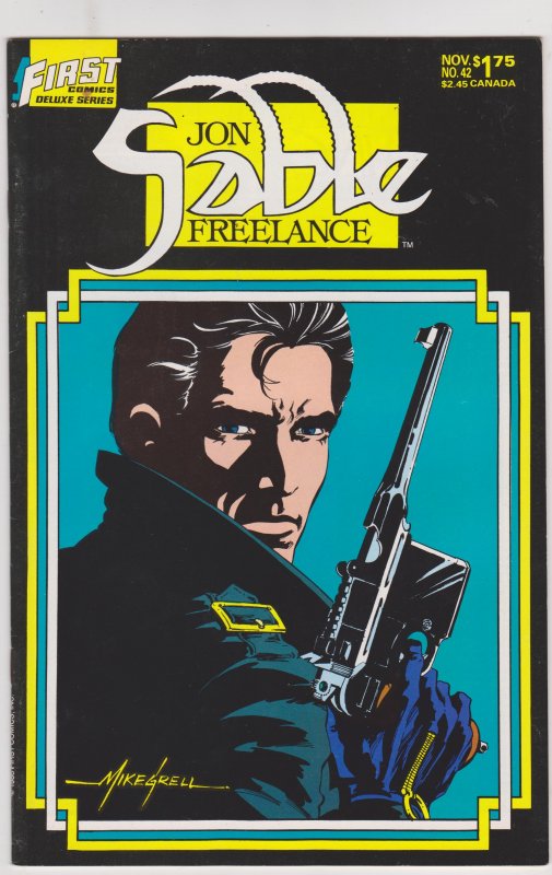 Jon Sable Freelance #42 by First Comics copyright 1986. I have graded the comic book, using the Ovwerstreet Grading Guide, at FINE+ with the following defects: Couple of light stress marks along the spine. The corners are rounded. There is some light yellowing of the pages.Seller Information