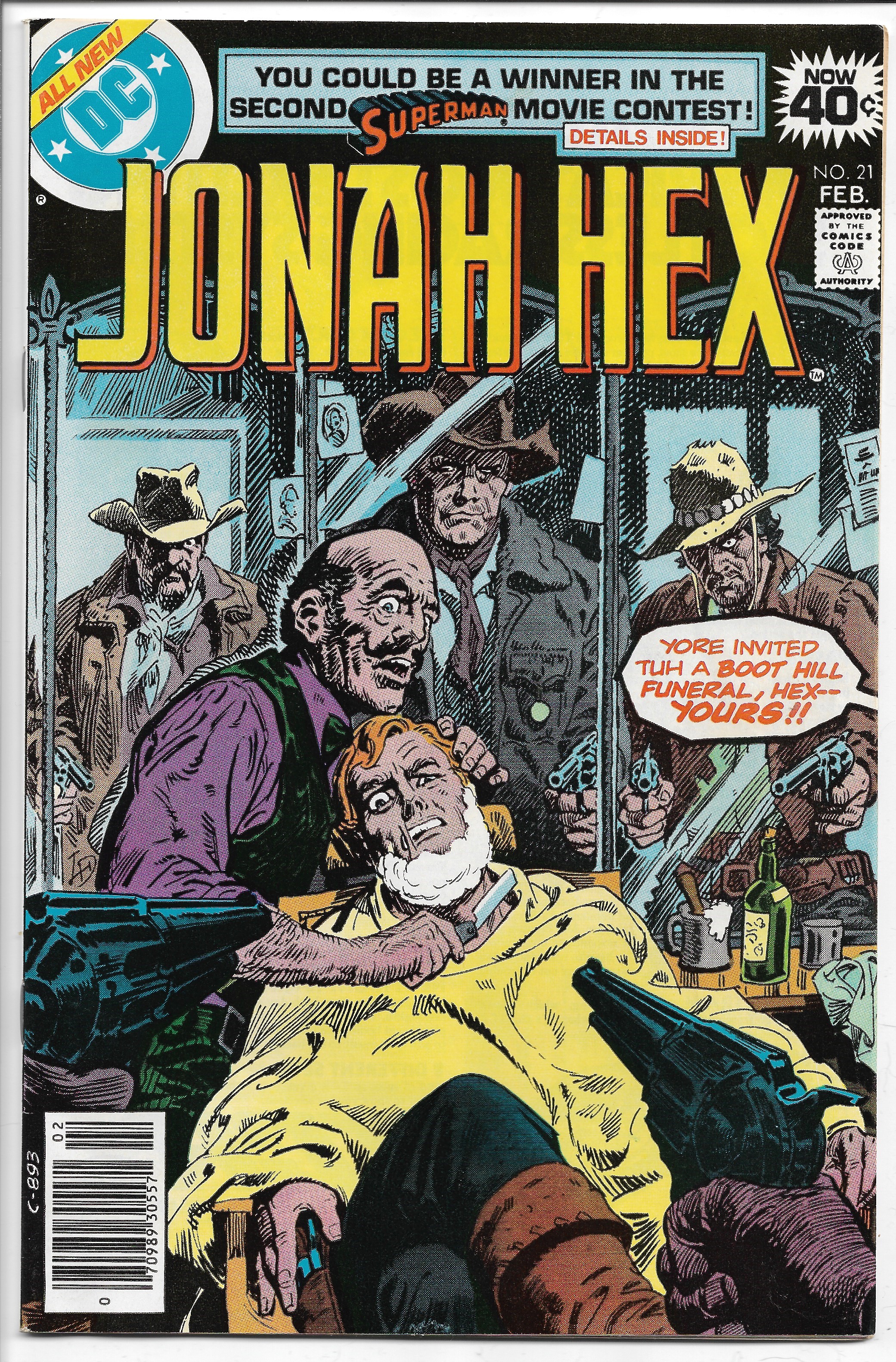 Jonah Hex #21, February, 1979. Condition Very Fine. (Selling this one for only $8.95).Jonah is invited to a boot hill funeral -- his own -- in "The Buryin'!" Appearance of Jonah's father. Characters: Jonah Hex; Woodson Hex; Zeke; Red; Frank. Written by Michael Fleisher, with art by Vicente Alcazar. Cover by Luis Dominguez. Cover price $0.40.