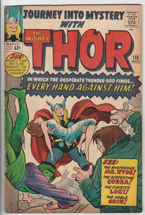 Journey into Mystery #110 - See: the Mysterious Mr. Hyde! the Serpentine Cobra! APPEARANCE - Mr. Hyde, Cobra APPEARANCE - Loki, Odin Wow! This book would be in Very Fine condition or better if not for heavy cream ... Read More