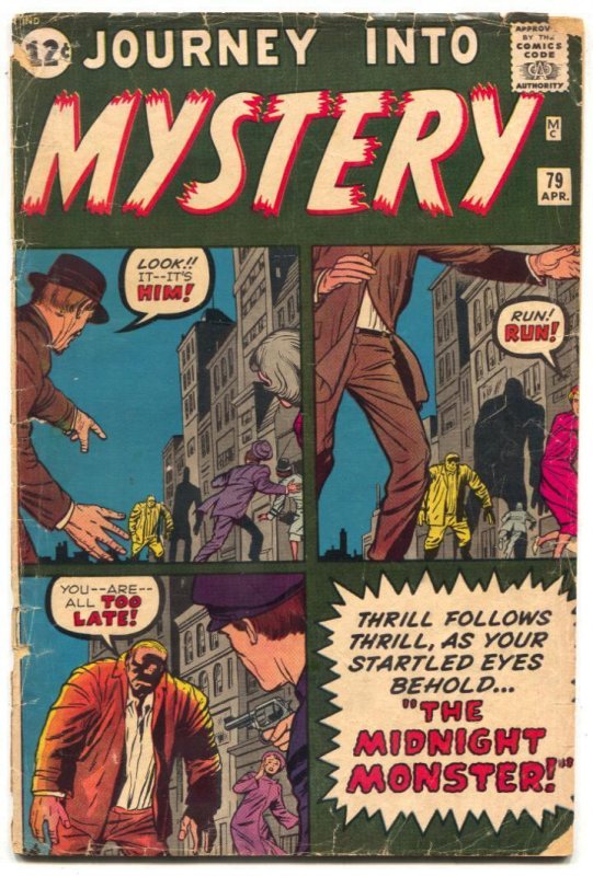 Journey Into Mystery Issue: 79 / Year: 1962 Condition: G-Jack Kirby terror cover and story. -Steve Ditko and Joe Sinnott art. -Prototype story Mr Hyde. -Cover detached. Publisher: MarvelSku: LI-08-281 Over 100,000 mail orders processed! Buy with confidence. Track Page Views WithAuctiva's Counter