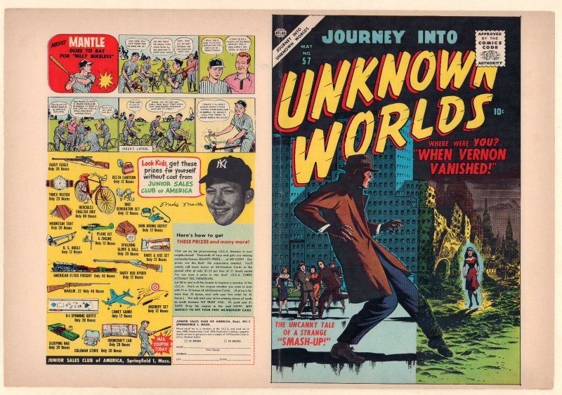 Condition: NOTE: This is an UNUSED comic book cover that never got stapled into a book. It may have some light ... Read more about the seller notes NOTE: This is an UNUSED comic book cover that never got stapled into a book. It may have some light wear, small tears, and fraying around the edges. Read Less about the seller notesJourney into Unknown Worlds #57 Unused Comic Book Cover - (Grade 8.0) 1957Size: 15.5" x 11"This item was uploaded by Bobby.If you have any specific questions or requests, please ask us prior to ordering and we'll get back to you as soon as we can. If there are any problems with your order whatsoever, please message us before leaving feedback and we'll be happy to work with you to fix the situation! We ship worldwide, combine purchases, and charge exact shipping. The price may vary based on size, weight, and location. If you are automatically overcharged for shipping, message us and we'll be happy to revise the invoice or refund you the excess amount. If you have any questions regarding shipping, please message us. International Buyers - Please Note: Import duties, taxes, and charges are not included in the item price or shipping cost. These charges are the buyer's responsibility. Please check with your country's customs office to determine what these additional costs will be prior to bidding or buying. Payment can be made by PayPal and credit cards directly. 70,000+ items in total in my Hip store! Frequently Asked Questions: When are your operation hours?Our in office hours are Monday - Friday, 11 am - 9 pm. We are not open on weekends, so if you send us a request on Friday evening we won't get back to you until Monday afternoon. Please don't take it as us ignoring you! We will work on your request Monday and get back to you as soon as we can. Also, if you order from us on a Friday evening or Saturday morning we won't start processing your order until we open on Monday. That means on Monday it will be pulled and prepped for shipping, then picked up by the postman on Tuesday morning.When will you ship my item? The tracking hasn't moved.We realize you're eager to get your item, so if the tracking hasn't moved in a few days please don't be concerned. We give the postman a lot of packages daily, sometimes as many as 100, so he does not scan each item for us upon pickup as he says it would be too time consuming for him to do so. If you get a tracking number from us, that almost always means your item was picked up by the postman the next business day. The USPS is also imperfect. There are times when the tracking won't even show movement until it's in your area's regional distribution center. This is normal in our experience. Is the item pictured the exact one for sale?Yes! We don't use stock images and go through great lengths to scan or photograph everything we list. The item pictured is exactly what you should receive UNLESS it is a fixed price listing with multiple items available. Can you issue a COA? We can, upon request. Please make sure you leave us a note while checking out and shoot us a message immediately after requesting one, just to be sure. How do you grade?Grading is very subjective, but we are professionals with decades of grading experience between us who try the best we can to accurately describe the condition of the items we list. Anthony is an Overstreet Comic Book Price Guide Advisor Please see the grading chart below for a breakdown of how we grade: NOTE: We don't grade any raw books higher than 9.2, as once you go higher than that grading gets really subjective. If you buy a NM book from us, it may very well be higher than 9.2 but we play it safe and grade conservatively. 9.2 NM Near Mint 9.0 VF/NM Very Fine/Near Mint 8.5 VF+ Very Fine+ 8.0 VF Very Fine 7.5 VF- Very Fine- 7.0 FN/VF Fine/Very Fine 6.5 FN+ Fine+ 6.0 FN Fine 5.5 FN- Fine- 5.0 VG/FN Very Good/Fine 4.5 VG+ Very Good+ 4.0 VG Very Good 3.5 VG- Very Good- 3.0 GD/VG Good/Very Good 2.5 GD+ Good+ 2.0 GD Good 1.8 GD- Good- 1.5 FR/GD Fair/Good 1.0 FR Fair 0.5 PR PoorHow do you ship comics? We ship in rigid cardboard mailers to protect your comic book from the worst the mail system has to offer. Price varies based on the number of books you purchase, but we try to keep costs as low as we can and charge exact shipping. If it looks unusually high to you please send us a message and we'll be happy to double check for you. Do you combine shipping? Yes, of like items. Such as: several comics can fit in one cardboard mailer, as can more than one record. Multiple art pages can easily be combined because they are light and thin. Where combined shipping differs is with size and weight. For instance, two statues require a much bigger box. Same goes for CGCs, as the package gets bigger and heavier as you go. Do you ship well? I've had some bad experiences... You needn't worry; we are professionals who value your business and want your item to arrive safely as much as you do. I have been collecting for over 30 years. I send out items the way I would like to receive them. The tracking says my item is "OUT FOR DELIVERY" in New Jersey. Why is that?If the tracking indicates that the item is "OUT FOR DELIVERY" in NJ don't worry, it's just what the tracking says when it's carried over from the postman to the sorting center. This is normal for our Post Office and will not impact you receiving your item in a timely matter.What is the difference between a RUN and a LOT?Good question. A RUN will be a collection of consecutive issues with no breaks in between them. If it says RUN of #s 1 - 50 you will receive 50 consecutive comics. A LOT will be within a certain range, so a 50pc LOT will not contain consecutive books.I changed my mind after successfully winning the auction or fixed price listing, will you cancel the transaction? Please only bid or hit BUY IT NOW if you are willing to follow through and pay for the item, we will not cancel the transaction. As a seller, Hip penalizes us every time we cancel an order, s