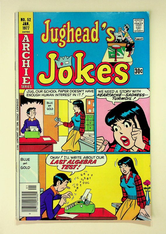 Grade: 3.0 Good/Very GoodThis is a comic of Jughead's Jokes No. 52 published by Archie Comics in Jan., 1977. The grade is probably at least a Good/Very Good but I will leave that up to the buyer to determine from the scans.The pictures are of the actual copy being auctioned. The pages are complete and intact. The comic book has been stored bagged and boarded in a climate controlled environment in a smoke free home.If you would like more information, please feel free to ask. Please check out our other listings for more interesting items. I combine shipping whenever possible. All items are well packed and sent by First Class mail.New shipping prices: Buy any number of non-CGC graded comics and the First Class Package (or better) shipping all of them together is one flat fee of $5.99! Buy any CGC graded comic, pay the Priority Mail rate and all non-CGC graded comics bought and sent in the same package are shipped for no additional charges.