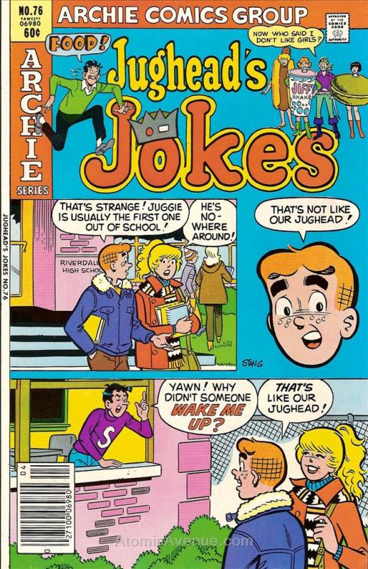 Item: Jughead's Jokes #76 | Publisher: Archie | Cover Date: April 1982 | With Economy shipping, each additional comic ships for just 50 cents more to customers in the USA. This listing contains a stock photo and information from ComicBase™ and © Human Computing. The stock photo is for reference only. If you would like to see a photo of the actual item, please message us prior to purchasing.Seller Information