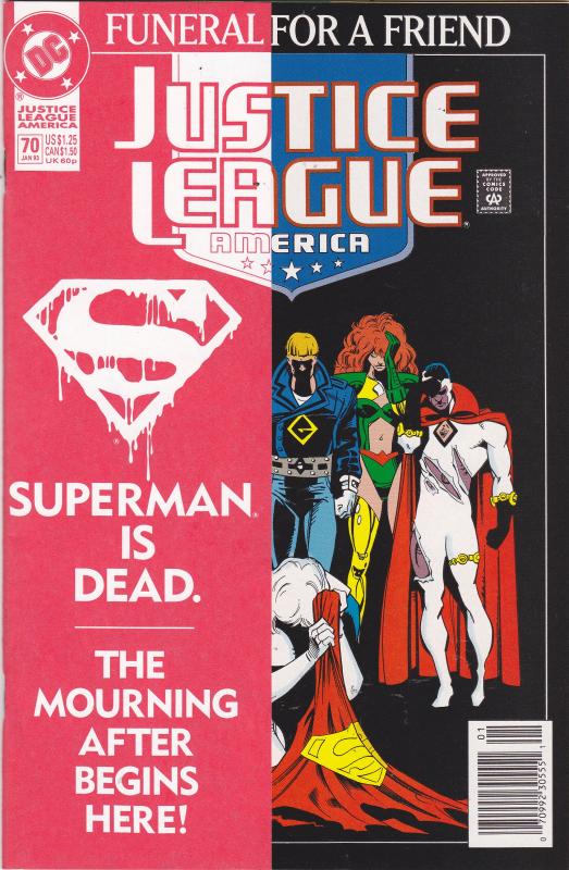 Justice League #70 by DC Comics copyright 1993. I have graded the comic book, using the Overstreet Grading Guide, at FINE+ with the following defects: Light stress marks along the spine . The corners are rounded. There is yellowing of the pages.Seller Information