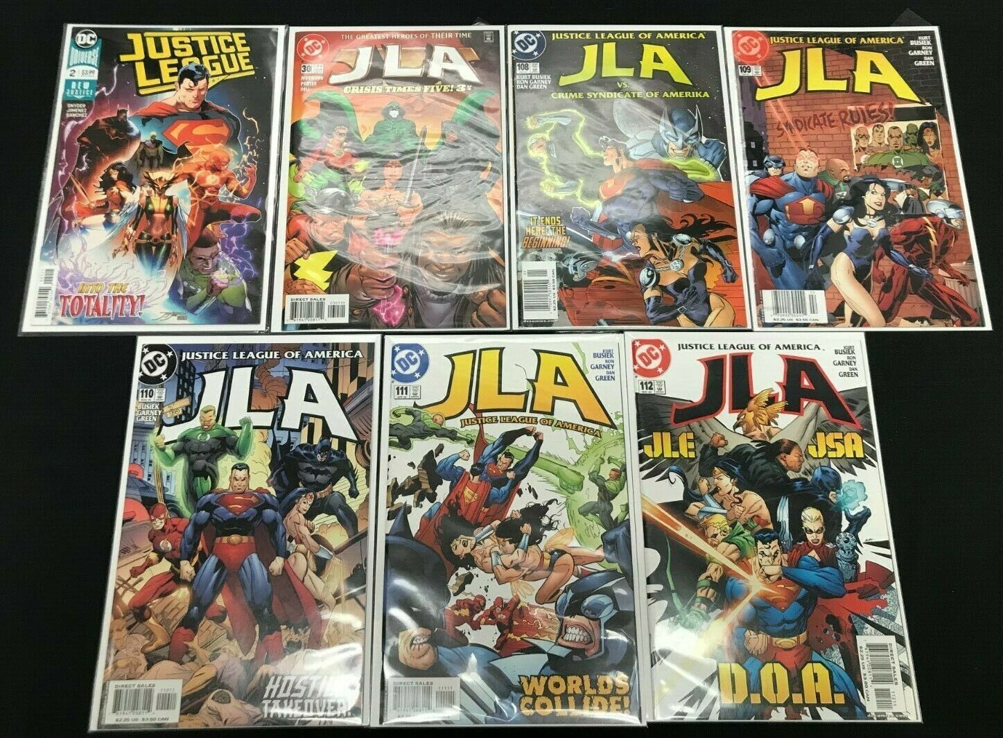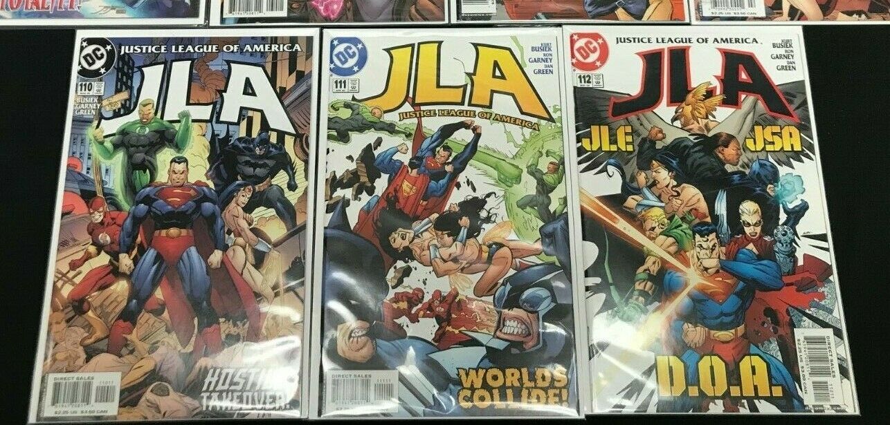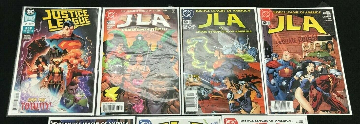 Condition: Justice League #2, Justice League of America #30, 108, 109, 110, 111, 112Justice league 7pc lot (vf/nm) into the totality!! 1999-2005size: 7" x 10"this item was uploaded by rv.We combine shipping!!! Either wait for us to send you an invoice after you commit to buy or, if it makes you pay right away, message us back and we'll refund the excess charge. Buy as many single comic books as you want for one low flat shipping rate in the united states! International will be charged exact according to size and weight. If you have any specific questions or requests, please ask us prior to ordering and we'll get back to you as soon as we can. If there are any problems with your order whatsoever, please message us before leaving feedback and we'll be happy to work with you to fix the situation! We ship worldwide, combine purchases, and charge exact shipping. The price may vary based on size, weight, and location. If you are automatically overcharged for shipping, message us and we'll be happy to revise the invoice or refund you the excess amount. If you have any questions regarding shipping, please message us. International buyers - please note: import duties, taxes, and charges are not included in the item price or shipping cost. These charges are the buyer's responsibility. Please check with your country's customs office to determine what these additional costs will be prior to bidding or buying. Payment can be made by paypal and credit cards directly. 120,000+ items in total in my Hip store! Frequently asked questions: when are your operation hours?Our in office hours are monday - friday, 11 am - 8 pm. We are not open on weekends, so if you send us a request on friday evening we won't get back to you until monday afternoon. Please don't take it as us ignoring you! We will work on your request monday and get back to you as soon as we can. Also, if you order from us on a friday evening or saturday morning we won't start processing your order until we open on monday. That means on monday it will be pulled and prepped for shipping, then picked up by the postman on tuesday morning.When will you ship my item? The tracking hasn't moved.We realize you're eager to get your item, so if the tracking hasn't moved in a few days please don't be concerned. We give the postman a lot of packages daily, sometimes as many as 100, so he does not scan each item for us upon pickup as he says it would be too time consuming for him to do so. If you get a tracking number from us, that almost always means your item was picked up by the postman the next business day. The usps is also imperfect. There are times when the tracking won't even show movement until it's in your area's regional distribution center. This is normal in our experience. Is the item pictured the exact one for sale?Yes! We don't use stock images and go through great lengths to scan or photograph everything we list. The item pictured is exactly what you should receive unless it is a fixed price listing with multiple items available. Can you issue a coa? We can, upon request. Please make sure you leave us a note while checking out and shoot us a message immediately after requesting one, just to be sure. How do you grade?Grading is very subjective, but we are professionals with decades of grading experience between us who try the best we can to accurately describe the condition of the items we list. Anthony is an overstreet comic book price guide advisor please see the grading chart below for a breakdown of how we grade: note: we don't grade any raw books higher than 9.2, as once you go higher than that grading gets really subjective. If you buy a nm book from us, it may very well be higher than 9.2 but we play it safe and grade conservatively. 9.2 nm near mint 9.0 vf/nm very fine/near mint 8.5 vf+ very fine+ 8.0 vf very fine 7.5 vf- very fine- 7.0 fn/vf fine/very fine 6.5 fn+ fine+ 6.0 fn fine 5.5 fn- fine- 5.0 vg/fn very good/fine 4.5 vg+ very good+ 4.0 vg very good 3.5 vg- very good- 3.0 gd/vg good/very good 2.5 gd+ good+ 2.0 gd good 1.8 gd- good- 1.5 fr/gd fair/good 1.0 fr fair 0.5 pr poorhow do you ship comics? We ship in rigid cardboard mailers to protect your comic book from the worst the mail system has to offer. Price varies based on the number of books you purchase, but we try to keep costs as low as we can and charge exact shipping. If it looks unusually high to you please send us a message and we'll be happy to double check for you. Do you combine shipping? Yes, of like items. Such as: several comics can fit in one cardboard mailer, as can more than one record. Multiple art pages can easily be combined because they are light and thin. Where combined shipping differs is with size and weight. For instance, two statues require a much bigger box. Same goes for cgcs, as the package gets bigger and heavier as you go. Do you ship well? I've had some bad experiences... You needn't worry; we are professionals who value your business and want your item to arrive safely as much as you do. I have been collecting for over 30 years. I send out items the way i would like to receive them. The tracking says my item is "out for delivery" in new jersey. Why is that?If the tracking indicates that the item is "out for delivery" in nj don't worry, it's just what the tracking says when it's carried over from the postman to the sorting center. This is normal for our post office and will not impact you receiving your item in a timely matter.What is the difference between a run and a lot?Good question. A run will be a collection of consecutive issues with no breaks in between them. If it says run of #s 1 - 50 you will receive 50 consecutive comics. A lot will be within a certain range, so a 50pc lot will not contain consecutive books.I changed my mind after successfully winning the auction or fixed price listing, will you cancel the transaction? Please only bid or hit buy it now if you are willing to follow through and pay for the item, we will not cancel the 