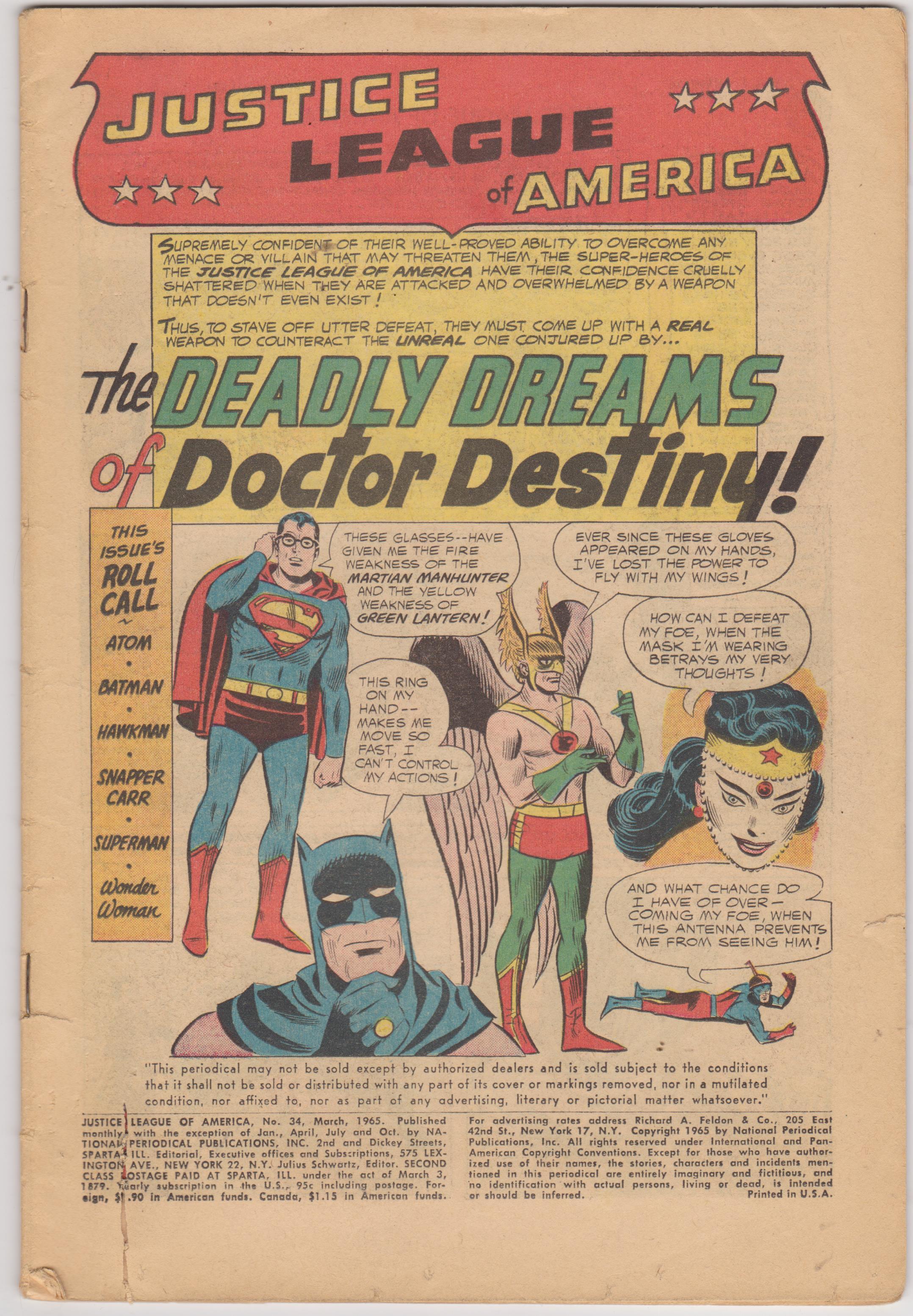 Justice League of America #34 by DC Comics copyright 1965. I have graded the comic book, using the Overstreet Grading Guide, at POOR with the following defects: Cover is missing. Light stress marks along the spine. Tear near the lower left edge. The corners are rounded. There is yellowing of the pages.Seller Information