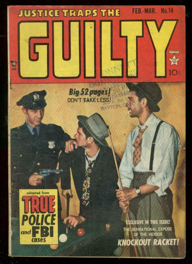 Justice Traps The Guilty Issue: 14 / Year: 1950 Condition: VG14thd issue. Pre-code crime comic, knock out drops used on man, hanging panel, violent issue, photo cover features pool table. The sing Sing story has art by Severin & Elder. Publisher: HeadlineSku: CK06-056 Over 100,000 mail orders processed! Buy with confidence.
