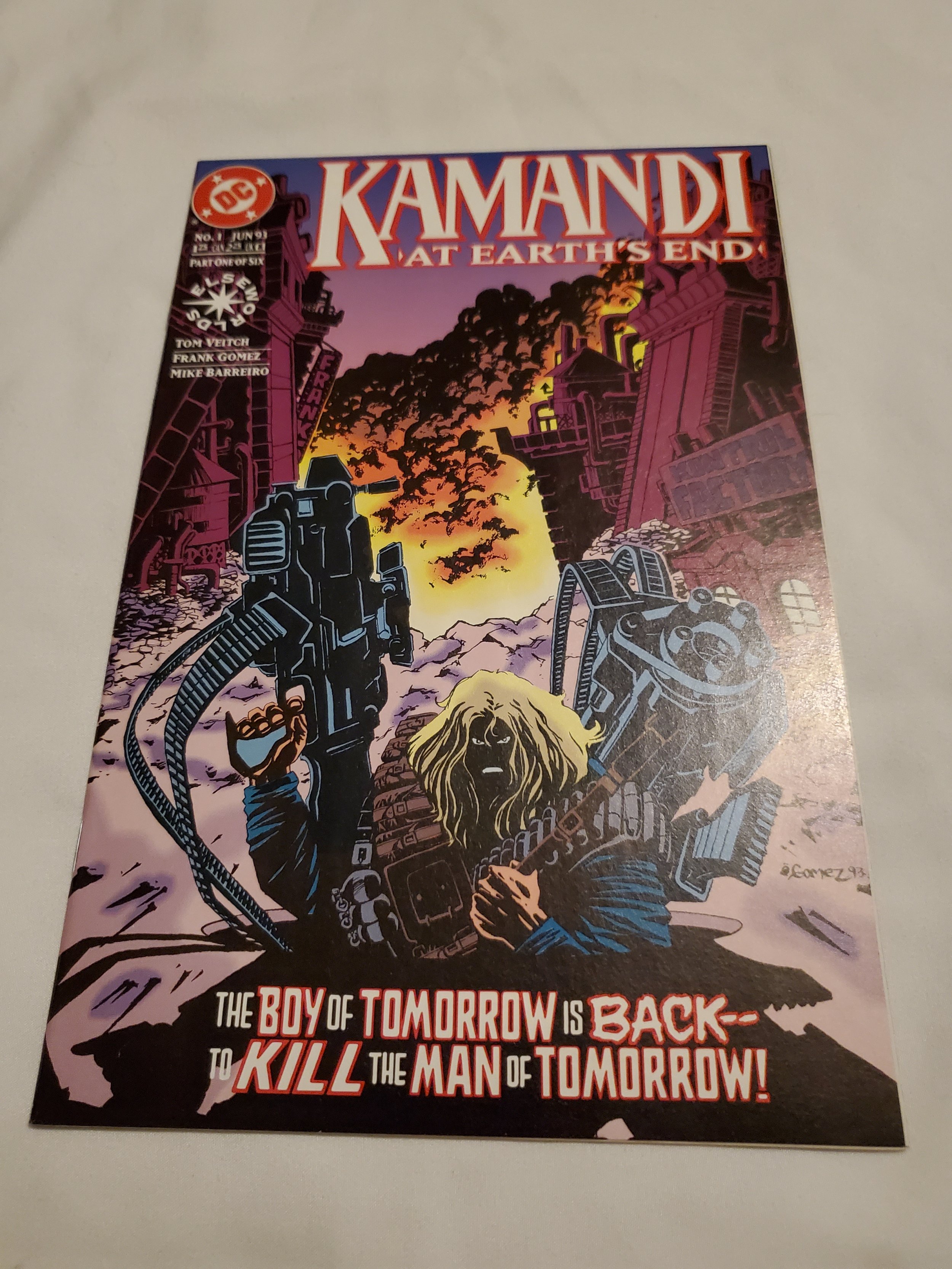 The classic Jack Kirby creation Kamandi returns in the Elseworlds miniseries KAMANDI: AT EARTH'S END, in which he takes on a darkly compelling world of the future. The Second Apocalypse devastated the world and turned men into monsters. But what caused this disaster has always been a mystery. Now Machine Mother, the artificial intelligence that has nurtured Kamandi since he was seven, sends him into the blasted landscape and poisoned air on a mission of vengeance: to find the menace who may have perpetrated the Second Apocalypse! Written by Tom Veitch, with art by Frank Gomez and Mike Barreiro. Cover by Gomez. New Format. Cover price $1.75.Seller Information