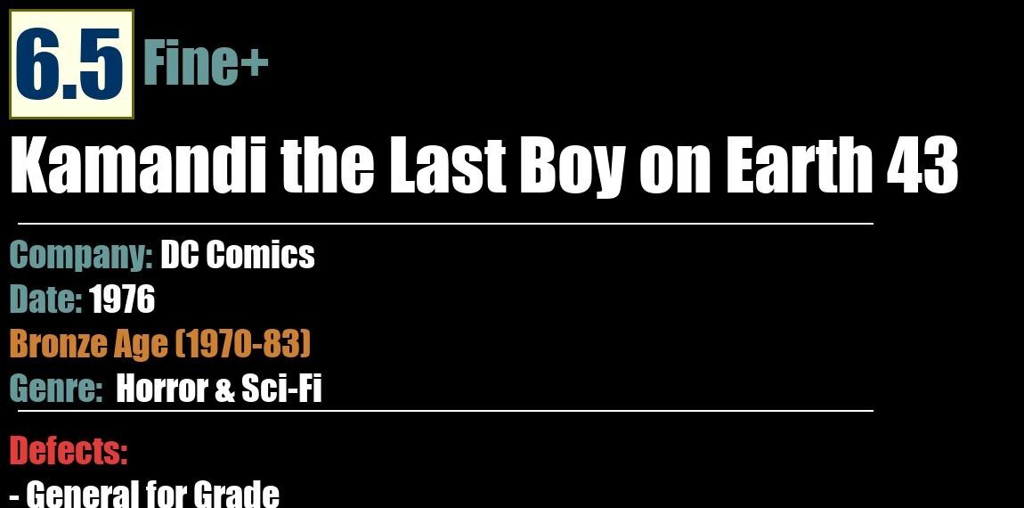 Grade: 6.5 Fine+Shipping may take up to 5 business daysKamandi the Last Boy on Earth 43DC Comics - 1976Horror & Sci-FiBronze Age (1970-83)6.5 Fine+Defects:- General for Grade:
