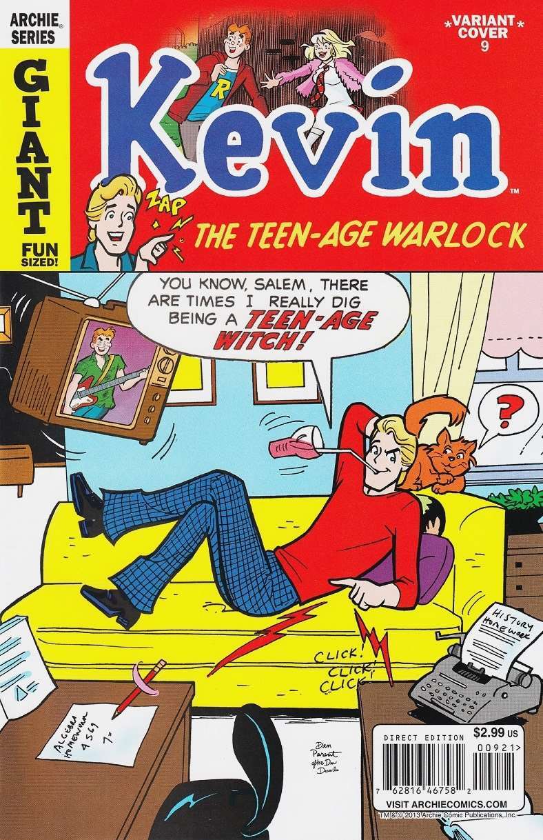Item: Kevin Keller #9A | Publisher: Archie | Cover Date: July 2013 | Writer: Dan Parent | Artist: Dan Parent | Cover Artist: Dan Parent | Storylines: The Tag-Alongs! | Notes: Variant Cover; Cover homage to Sabrina the Teenage Witch #1 | With Economy shipping, each additional comic ships for just 50 cents more to customers in the USA. This listing contains a stock photo and information from ComicBase™ and © Human Computing. The stock photo is for reference only. If you would like to see a photo of the actual item, please message us prior to purchasing.Seller Information