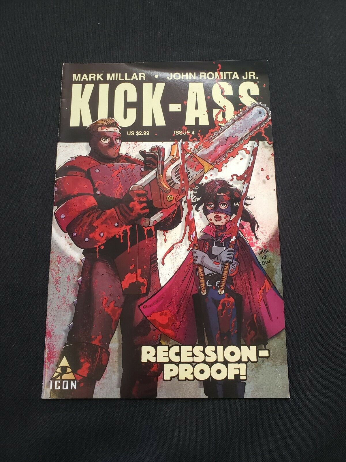 Kick-ass (nm-) issue #4, mark millar, john romita jr., recession proof 2009size: 7" x 10"this item was uploaded by tk.We combine shipping!!! Either wait for us to send you an invoice after you commit to buy or, if it makes you pay right away, message us back and we'll refund the excess charge. Buy as many single comic books as you want for one low flat shipping rate in the united states! International will be charged exact according to size and weight. If you have any specific questions or requests, please ask us prior to ordering and we'll get back to you as soon as we can. If there are any problems with your order whatsoever, please message us before leaving feedback and we'll be happy to work with you to fix the situation! We ship worldwide, combine purchases, and charge exact shipping. The price may vary based on size, weight, and location. If you are automatically overcharged for shipping, message us and we'll be happy to revise the invoice or refund you the excess amount. If you have any questions regarding shipping, please message us. International buyers - please note: import duties, taxes, and charges are not included in the item price or shipping cost. These charges are the buyer's responsibility. Please check with your country's customs office to determine what these additional costs will be prior to bidding or buying. Payment can be made by paypal and credit cards directly. 120,000+ items in total in my Hip store! Frequently asked questions: when are your operation hours?Our in office hours are monday - friday, 11 am - 8 pm. We are not open on weekends, so if you send us a request on friday evening we won't get back to you until monday afternoon. Please don't take it as us ignoring you! We will work on your request monday and get back to you as soon as we can. Also, if you order from us on a friday evening or saturday morning we won't start processing your order until we open on monday. That means on monday it will be pulled and prepped for shipping, then picked up by the postman on tuesday morning.When will you ship my item? The tracking hasn't moved.We realize you're eager to get your item, so if the tracking hasn't moved in a few days please don't be concerned. We give the postman a lot of packages daily, sometimes as many as 100, so he does not scan each item for us upon pickup as he says it would be too time consuming for him to do so. If you get a tracking number from us, that almost always means your item was picked up by the postman the next business day. The usps is also imperfect. There are times when the tracking won't even show movement until it's in your area's regional distribution center. This is normal in our experience. Is the item pictured the exact one for sale?Yes! We don't use stock images and go through great lengths to scan or photograph everything we list. The item pictured is exactly what you should receive unless it is a fixed price listing with multiple items available. Can you issue a coa? We can, upon request. Please make sure you leave us a note while checking out and shoot us a message immediately after requesting one, just to be sure. How do you grade?Grading is very subjective, but we are professionals with decades of grading experience between us who try the best we can to accurately describe the condition of the items we list. Anthony is an overstreet comic book price guide advisor please see the grading chart below for a breakdown of how we grade: note: we don't grade any raw books higher than 9.2, as once you go higher than that grading gets really subjective. If you buy a nm book from us, it may very well be higher than 9.2 but we play it safe and grade conservatively. 9.2 nm near mint 9.0 vf/nm very fine/near mint 8.5 vf+ very fine+ 8.0 vf very fine 7.5 vf- very fine- 7.0 fn/vf fine/very fine 6.5 fn+ fine+ 6.0 fn fine 5.5 fn- fine- 5.0 vg/fn very good/fine 4.5 vg+ very good+ 4.0 vg very good 3.5 vg- very good- 3.0 gd/vg good/very good 2.5 gd+ good+ 2.0 gd good 1.8 gd- good- 1.5 fr/gd fair/good 1.0 fr fair 0.5 pr poorhow do you ship comics? We ship in rigid cardboard mailers to protect your comic book from the worst the mail system has to offer. Price varies based on the number of books you purchase, but we try to keep costs as low as we can and charge exact shipping. If it looks unusually high to you please send us a message and we'll be happy to double check for you. Do you combine shipping? Yes, of like items. Such as: several comics can fit in one cardboard mailer, as can more than one record. Multiple art pages can easily be combined because they are light and thin. Where combined shipping differs is with size and weight. For instance, two statues require a much bigger box. Same goes for cgcs, as the package gets bigger and heavier as you go. Do you ship well? I've had some bad experiences... You needn't worry; we are professionals who value your business and want your item to arrive safely as much as you do. I have been collecting for over 30 years. I send out items the way i would like to receive them. The tracking says my item is "out for delivery" in new jersey. Why is that?If the tracking indicates that the item is "out for delivery" in nj don't worry, it's just what the tracking says when it's carried over from the postman to the sorting center. This is normal for our post office and will not impact you receiving your item in a timely matter.What is the difference between a run and a lot?Good question. A run will be a collection of consecutive issues with no breaks in between them. If it says run of #s 1 - 50 you will receive 50 consecutive comics. A lot will be within a certain range, so a 50pc lot will not contain consecutive books.I changed my mind after successfully winning the auction or fixed price listing, will you cancel the transaction? Please only bid or hit buy it now if you are willing to follow through and pay for the item, we will not cancel the transaction. As a seller, Hip penalizes us every time we cancel an or