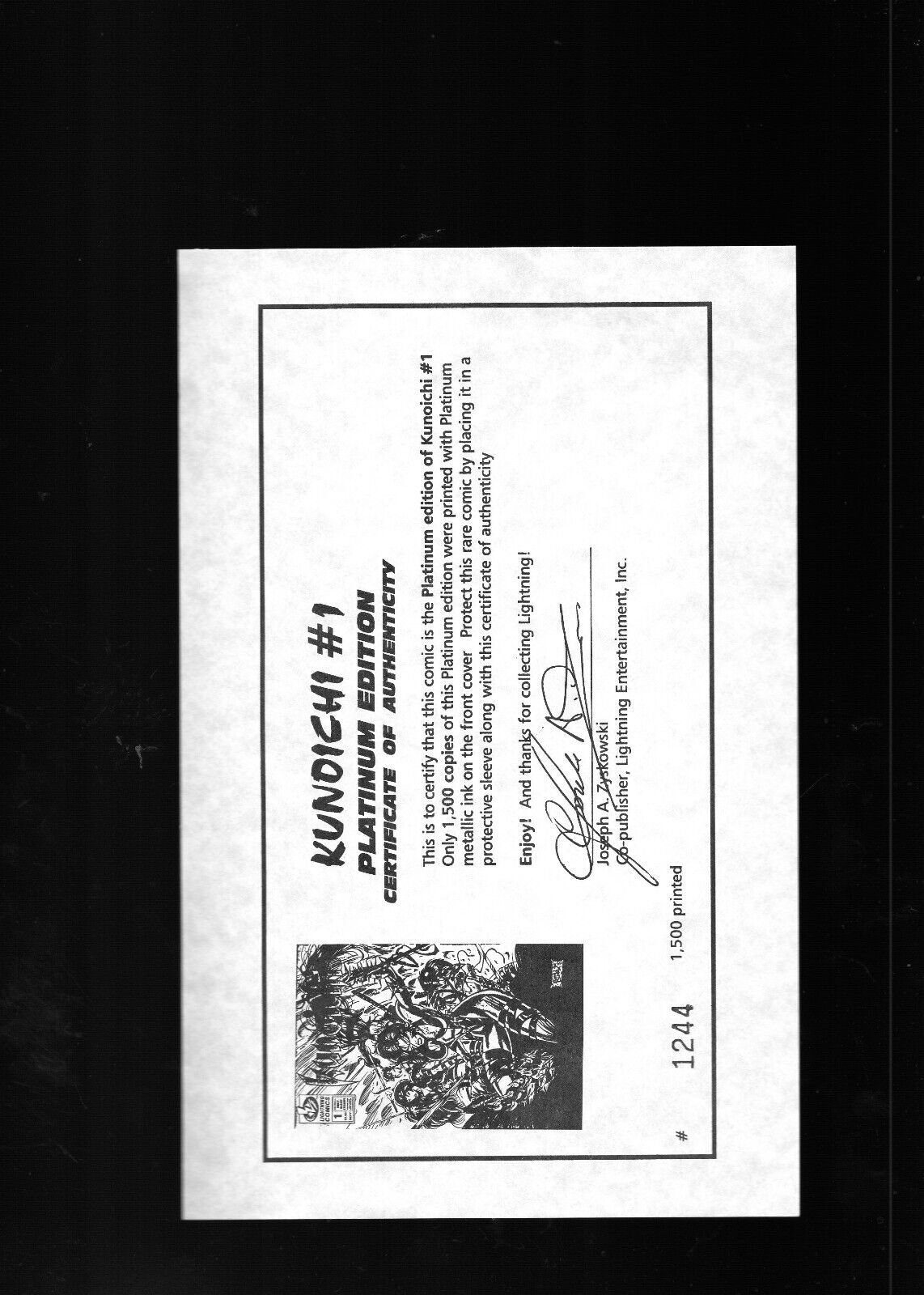 Grade: 9.2 Near Mint-Kunoichi #1 - John Cleary, Greg Weed Cover Art. Platinum Edition. (9.2 OB) 1996Size: 7" x 10"This item was uploaded by ___JI___.WE COMBINE SHIPPING!!! Either wait for us to send you an invoice after you commit to buy or, if it makes you pay right away, message us back and we'll refund the excess charge. Buy as many single comic books as you want for one low flat shipping rate in the United States! International will be charged exact according to size and weight. If you have any specific questions or requests, please ask us prior to ordering and we'll get back to you as soon as we can. If there are any problems with your order whatsoever, please message us before leaving feedback and we'll be happy to work with you to fix the situation! We ship worldwide, combine purchases, and charge exact shipping. The price may vary based on size, weight, and location. If you are automatically overcharged for shipping, message us and we'll be happy to revise the invoice or refund you the excess amount. If you have any questions regarding shipping, please message us. International Buyers - Please Note: Import duties, taxes, and charges are not included in the item price or shipping cost. These charges are the buyer's responsibility. Please check with your country's customs office to determine what these additional costs will be prior to bidding or buying. Payment can be made by PayPal and credit cards directly. 120,000+ items in total in my Hip store! Frequently Asked Questions: When are your operation hours?Our in office hours are Monday - Friday, 11 am - 8 pm. We are not open on weekends, so if you send us a request on Friday evening we won't get back to you until Monday afternoon. Please don't take it as us ignoring you! We will work on your request Monday and get back to you as soon as we can. Also, if you order from us on a Friday evening or Saturday morning we won't start processing your order until we open on Monday. That means on Monday it will be pulled and prepped for shipping, then picked up by the postman on Tuesday morning.When will you ship my item? The tracking hasn't moved.We realize you're eager to get your item, so if the tracking hasn't moved in a few days please don't be concerned. We give the postman a lot of packages daily, sometimes as many as 100, so he does not scan each item for us upon pickup as he says it would be too time consuming for him to do so. If you get a tracking number from us, that almost always means your item was picked up by the postman the next business day. The USPS is also imperfect. There are times when the tracking won't even show movement until it's in your area's regional distribution center. This is normal in our experience. Is the item pictured the exact one for sale?Yes! We don't use stock images and go through great lengths to scan or photograph everything we list. The item pictured is exactly what you should receive UNLESS it is a fixed price listing with multiple items available. Can you issue a COA? We can, upon request. Please make sure you leave us a note while checking out and shoot us a message immediately after requesting one, just to be sure. How do you grade?Grading is very subjective, but we are professionals with decades of grading experience between us who try the best we can to accurately describe the condition of the items we list. Anthony is an Overstreet Comic Book Price Guide Advisor Please see the grading chart below for a breakdown of how we grade: NOTE: We don't grade any raw books higher than 9.2, as once you go higher than that grading gets really subjective. If you buy a NM book from us, it may very well be higher than 9.2 but we play it safe and grade conservatively. 9.2 NM Near Mint 9.0 VF/NM Very Fine/Near Mint 8.5 VF+ Very Fine+ 8.0 VF Very Fine 7.5 VF- Very Fine- 7.0 FN/VF Fine/Very Fine 6.5 FN+ Fine+ 6.0 FN Fine 5.5 FN- Fine- 5.0 VG/FN Very Good/Fine 4.5 VG+ Very Good+ 4.0 VG Very Good 3.5 VG- Very Good- 3.0 GD/VG Good/Very Good 2.5 GD+ Good+ 2.0 GD Good 1.8 GD- Good- 1.5 FR/GD Fair/Good 1.0 FR Fair 0.5 PR PoorHow do you ship comics? We ship in rigid cardboard mailers to protect your comic book from the worst the mail system has to offer. Price varies based on the number of books you purchase, but we try to keep costs as low as we can and charge exact shipping. If it looks unusually high to you please send us a message and we'll be happy to double check for you. Do you combine shipping? Yes, of like items. Such as: several comics can fit in one cardboard mailer, as can more than one record. Multiple art pages can easily be combined because they are light and thin. Where combined shipping differs is with size and weight. For instance, two statues require a much bigger box. Same goes for CGCs, as the package gets bigger and heavier as you go. Do you ship well? I've had some bad experiences... You needn't worry; we are professionals who value your business and want your item to arrive safely as much as you do. I have been collecting for over 30 years. I send out items the way I would like to receive them. The tracking says my item is "OUT FOR DELIVERY" in New Jersey. Why is that?If the tracking indicates that the item is "OUT FOR DELIVERY" in NJ don't worry, it's just what the tracking says when it's carried over from the postman to the sorting center. This is normal for our Post Office and will not impact you receiving your item in a timely matter.What is the difference between a RUN and a LOT?Good question. A RUN will be a collection of consecutive issues with no breaks in between them. If it says RUN of #s 1 - 50 you will receive 50 consecutive comics. A LOT will be within a certain range, so a 50pc LOT will not contain consecutive books.I changed my mind after successfully winning the auction or fixed price listing, will you cancel the transaction? Please only bid or hit BUY IT NOW if you are willing to follow through and pay for the item, we will not cancel the transaction. As a seller, Hip penalize