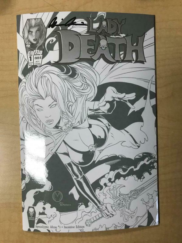 We are selling a NM unread copy of COFFIN COMICS LADY DEATH: APOCALYPTIC ABYSS #1 INCENTIVE EDITION VARIANT cover by MARAT MYCHAELS!!!1:10 Dealer Incentive variant cover!!!