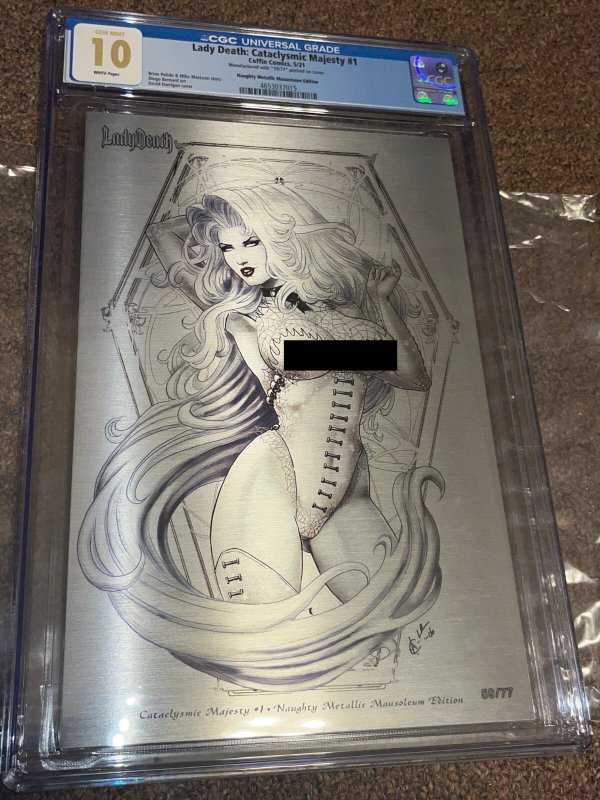 Grade: 10 Gem Mint Up for sale is a Lady Death Cataclysmic Majesty 1 (2021). This is the naughty metallic variant cover (limited to only 77). The book has been graded by CGC at 10 (single highest). The case is in g ... Read More