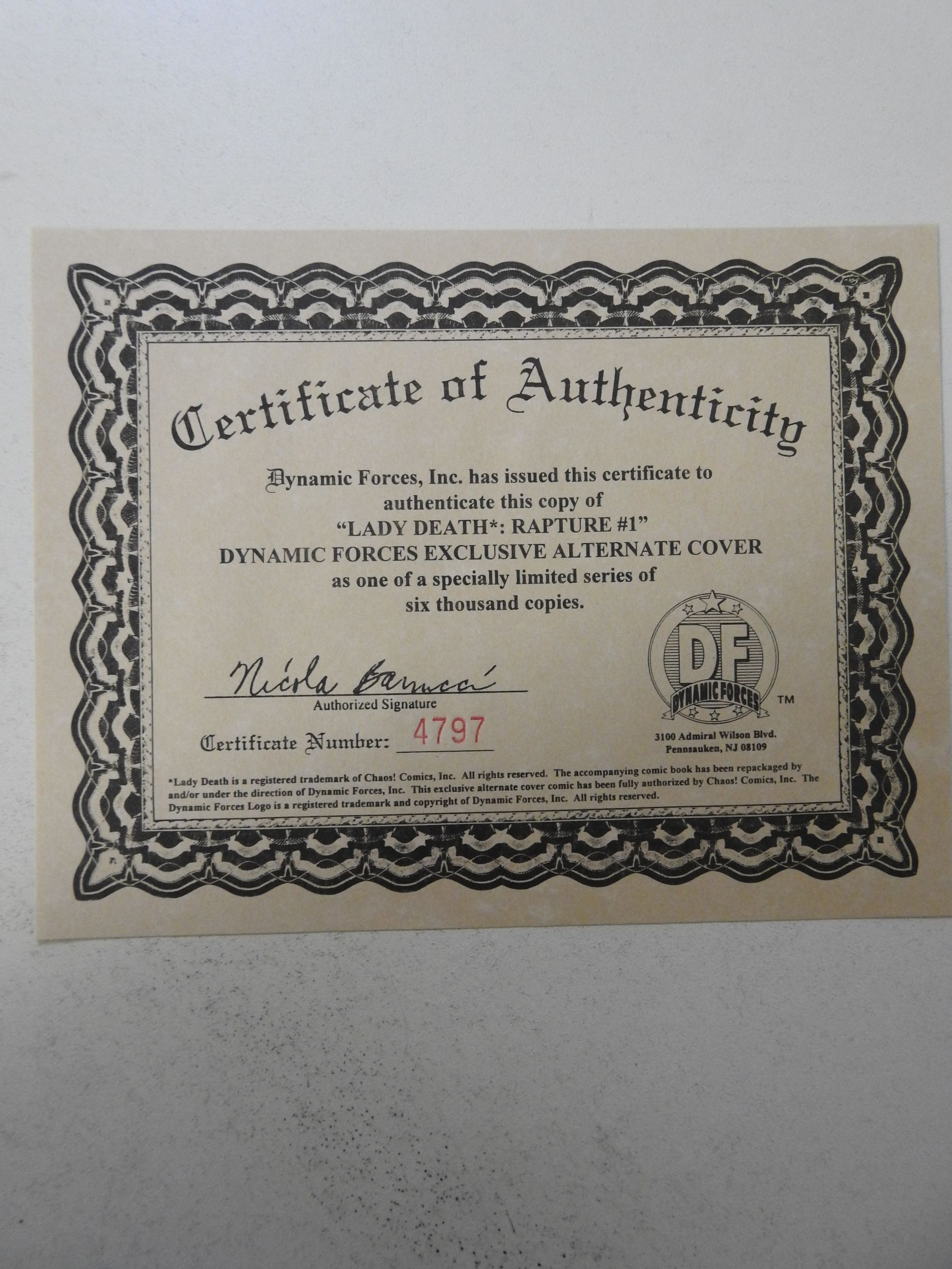Lady Death: The Rapture #1 Dynamic Forces Cover (1999) NM- Condition! W/ COA!