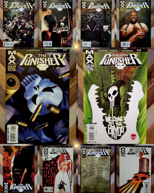 Lot of 10: PUNISHER Comics (Marvel MAX 2004) Garth Ennis! VF/NM 9.0 Explicit Custom bundle includes ten (10) comics Includes issues #46, 48, 50-53, 55, 69, 72-73 Avg. VF/NM approx 9.0 for the lot Written by Garth En ... Read More