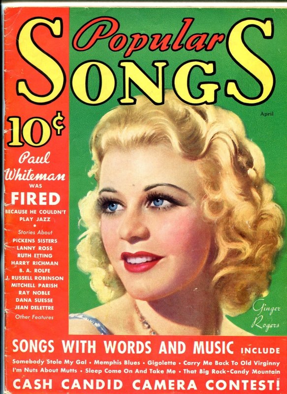 Popular Songs Magazine April 1935- Ginger Rogers- Ginger Rogers cover. Richard Himber, BA Rolfe, Ruth Etting and more. Centerfold loose but complete. Grade: VG SKU: MEN05-106
