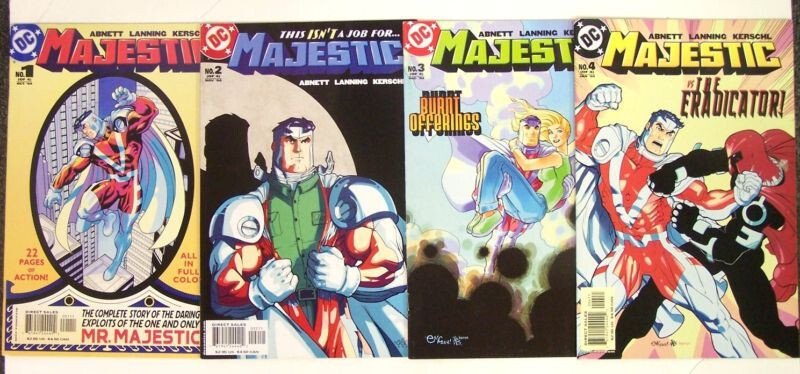Majestic #1 [of 4] (October)Dan Abnett & Andy Lanning, Karl Kerschl, Karl KerschlSuperman talks to Mr Majestic about being more approachable as he's scaring everyone on Earth, including the JLA. Majestros thinks about it as he continues building a satelite which he hopes will return him back to his own Earth... but the Eradicator picks a fight with him, destroying Majestic's work, accidentally causing the Eradicator to self-destruct. Creating a secret identity of Jim McArest, Majestros rents a room with a young family.