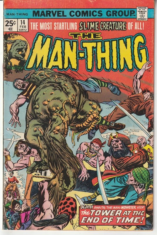 Guardians of the galaxy/howard the duck creator writer steve gerber and fantasy artist alfredo alcala place man thing in a time lost castle defending its occupants from the space pirate, captain fate !