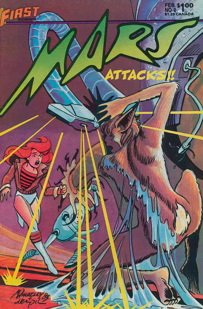 Item: Mars (First) #2 | Publisher: First | Cover Date: February 1984 | Writer: Mark Wheatley, Marc Hempel, Peter B. Gillis | Artist: Mark Wheatley, Marc Hempel, Tom Sutton | Cover Artist: Mark Wheatley, Marc Hempel | Storylines: Mars Attacks!; Black Flame: The Closet | Notes: Black Flame back-up story | With Economy shipping, each additional comic ships for just 50 cents more to customers in the USA. This listing contains a stock photo and information from ComicBase™ and © Human Computing. The stock photo is for reference only. If you would like to see a photo of the actual item, please message us prior to purchasing.Seller Information