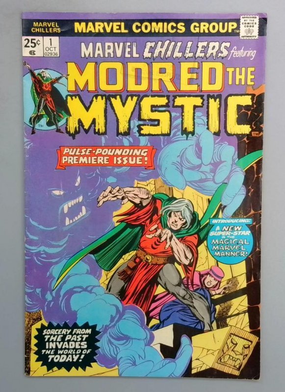 MARVEL CHILLERS #1 - Marvel Comics Group, October 1975. A pulse-pounding premiere issue introducing MODRED THE MYSTIC, a new magical Marvel character to the universe. This issue features sorcery from the past invading the world of today, as mysterious blue mystical forces threaten. The cover showcases Modred in his signature red and green costume alongside magical imagery, promising supernatural adventure and intrigue. As a first appearance of this character, this is a notable entry in Marvel's horror and magic-themed anthology series from the Bronze Age.