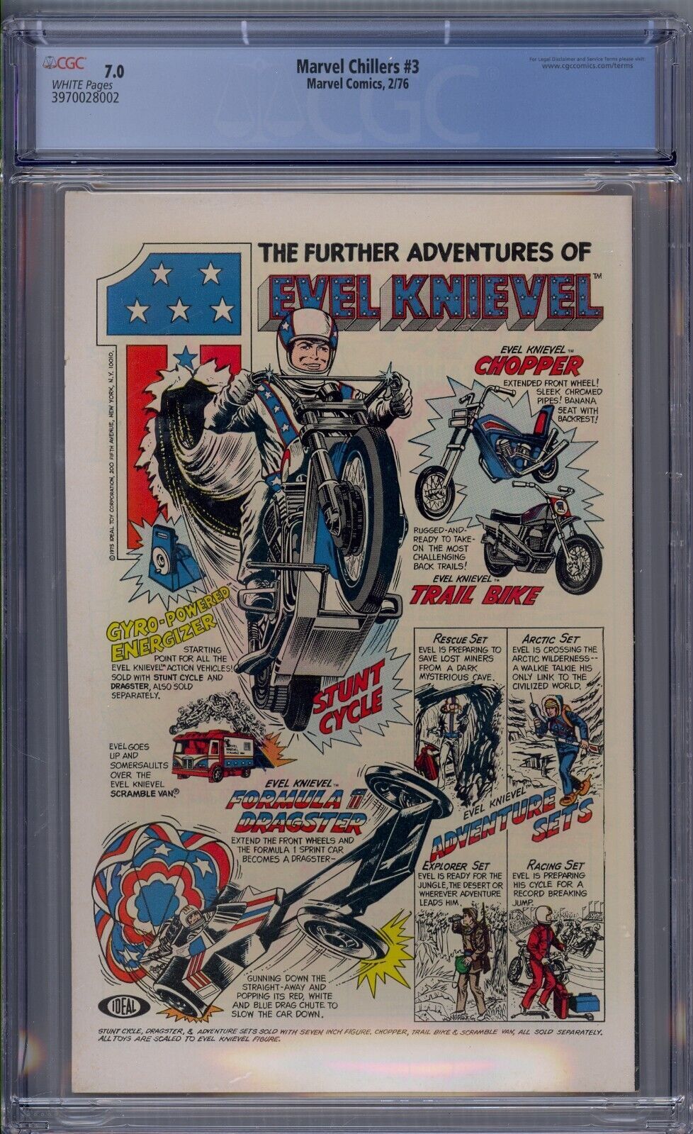 Grade: 7.0 Fine/Very FineMarvel Chillers #3 CGC 7.0.You will receive exactly what is pictured in the listing. Items will be shipped extremely carefully to insure they arrive in excellent condition.All S/H for this auction varies. I do combine items for shipping. Insurance is included with all shipping. For International buyers please note any custom fees charged by your country are your responsibility. I will always try to accommodate any special requests.If there are ever any problems regarding your purchase please contact me prior to putting in claims, leaving negative feedback, or giving out low ratings. I aim for 5 out of 5 stars all the time and will always do my best to fix any issues. I always make sure my customers are happy!!!!I ship fast and secure, just check my feedback. Please feel free to E-mail me with any questions or if you need larger scans. Please check out my other auctions!! Happy Bidding. Good Luck.