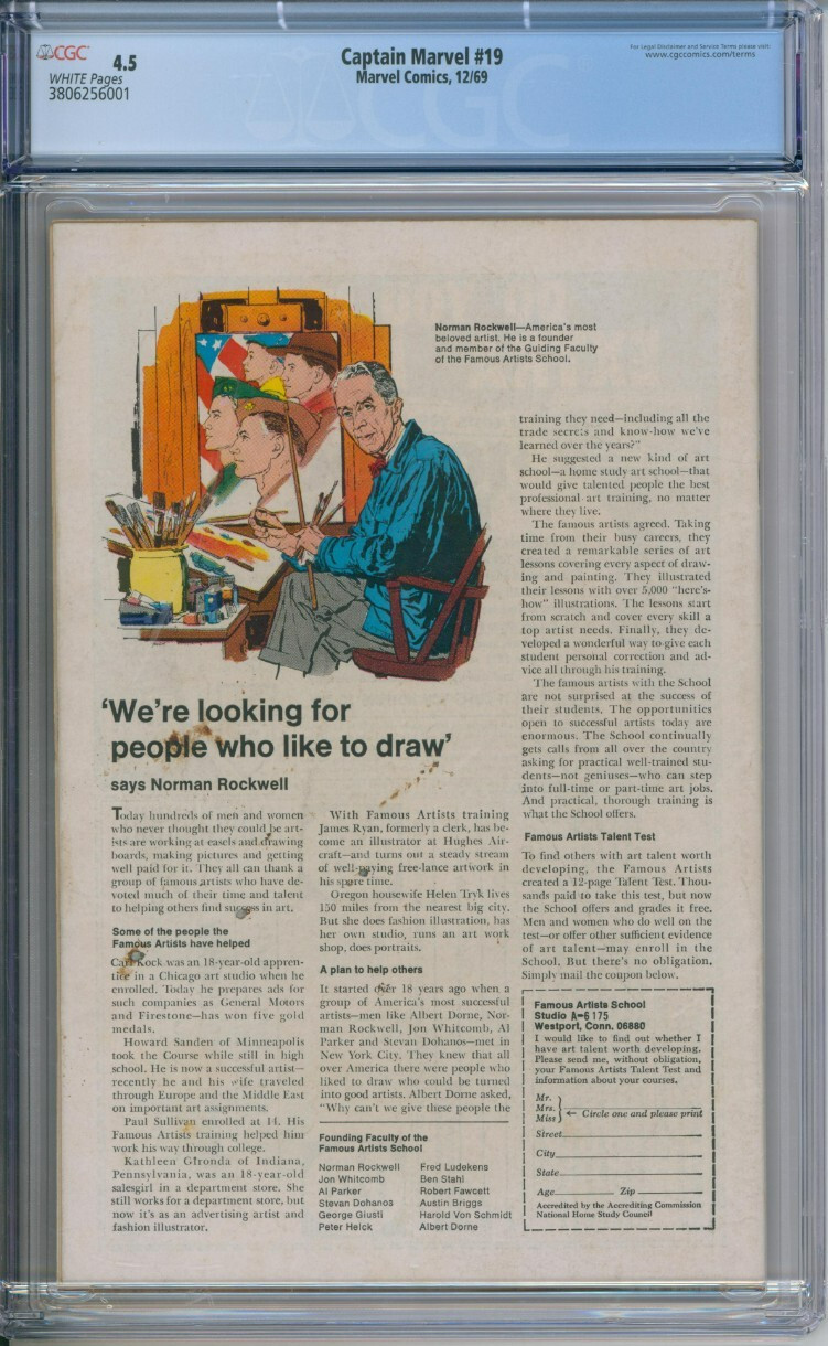 Grade: 4.5 Very Good+Marvel Comics Captain Marvel #19 CGC 4.5 Gil Kane Captain Marvel #19 CGC 4.5Marvel Comics, 12/69White PagesCGC Cert #3806256001TitleCaptain MarvelIssue19Issue Date12/69Issue Year1969PublisherMarvel ComicsGrade4.5Page QualityWHITEGrade Date2021-05-25Label CategoryUniversalArt CommentsRoy Thomas storyGil Kane and Dan Adkins cover and artGrader Notesmoderate creasing to covermoderate bends to covermoderate spine stress lines to covermoderate staining to covermoderate wear all corners of coverSEE PHOTOS FOR ACTUAL PRODUCTALL ITEMS SHIPPED SECURELY** CHECK OUR STORE FOR MORE GREAT CGC GRADED ITEMS!!!WE OFFER COMBINED SHIPPING ON ALL ITEMS!!OR REQUEST LOCAL PICK UP IF YOU ARE IN THE METRO DETROIT AREA!WE SHIP INTERNATIONALLY USING Hip GLOBAL SHIPPINGBIG BEN'S COMIX OASIS HAS BEEN SERVING CUSTOMERS OF COMICS AND COLLECTIBLES FOR OVER 30 YEARS. WE HAVE AN EXTENSIVE INVENTORY AND A KNOWLEDGEABLE STAFF. CHECK OUT OUR Hip STORE FOR MORE COOL AND RARE ITEMS! ALSO WE ARE ALWAYS BUYING COMICS! Captain Marvel #19 CGC 4.5Marvel Comics, 12/69White PagesCGC Cert #3806256001TitleCaptain MarvelIssue19Issue Date12/69Issue Year1969PublisherMarvel ComicsGrade4.5Page QualityWHITEGrade Date2021-05-25Label CategoryUniversalArt CommentsRoy Thomas storyGil Kane and Dan Adkins cover and artGrader Notesmoderate creasing to covermoderate bends to covermoderate spine stress lines to covermoderate staining to covermoderate wear all corners of coverSEE PHOTOS FOR ACTUAL PRODUCTALL ITEMS SHIPPED SECURELY** CHECK OUR STORE FOR MORE GREAT CGC GRADED ITEMS!!!WE OFFER COMBINED SHIPPING ON ALL ITEMS!!OR REQUEST LOCAL PICK UP IF YOU ARE IN THE METRO DETROIT AREA!WE SHIP INTERNATIONALLY USING Hip GLOBAL SHIPPINGBIG BEN'S COMIX OASIS HAS BEEN SERVING CUSTOMERS OF COMICS AND COLLECTIBLES FOR OVER 30 YEARS. WE HAVE AN EXTENSIVE INVENTORY AND A KNOWLEDGEABLE STAFF. CHECK OUT OUR Hip STORE FOR MORE COOL AND RARE ITEMS! ALSO WE ARE ALWAYS BUYING COMICS! Hip integration by