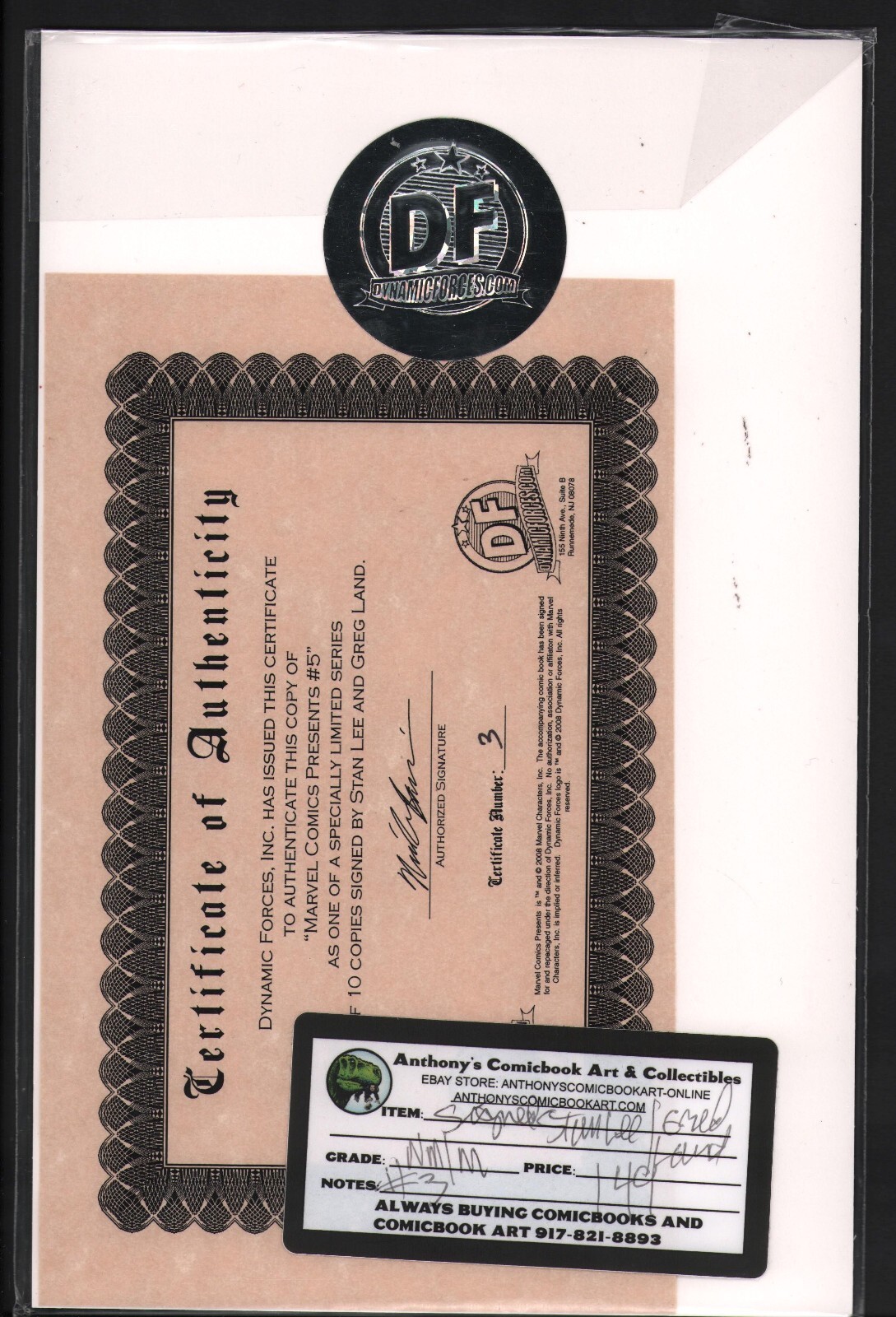 Marvel Comics Presents #5 (NM) Signed by Stan Lee & Greg Land - with COA - 2008Size: 7" x 10"This item was uploaded by RV.WE COMBINE SHIPPING!!! Either wait for us to send you an invoice after you commit to buy or, if it makes you pay right away, message us back and we'll refund the excess charge. Buy as many single comic books as you want for one low flat shipping rate in the United States! International will be charged exact according to size and weight.If you have any specific questions or requests, please ask us prior to ordering and we'll get back to you as soon as we can.If there are any problems with your order whatsoever, please message us before leaving feedback and we'll be happy to work with you to fix the situation! We ship worldwide, combine purchases, and charge exact shipping. The price may vary based on size, weight, and location. If you are automatically overcharged for shipping, message us and we'll be happy to revise the invoice or refund you the excess amount. If you have any questions regarding shipping, please message us.International Buyers - Please Note:Import duties, taxes, and charges are not included in the item price or shipping cost. These charges are the buyer's responsibility.Please check with your country's customs office to determine what these additional costs will be prior to bidding or buying.Payment can be made by PayPal and credit cards directly.120,000+ items in total in my Hip store!Frequently Asked Questions:When are your operation hours?Our in office hours are Monday - Friday, 11 am - 8 pm. We are not open on weekends, so if you send us a request on Friday evening we won't get back to you until Monday afternoon. Please don't take it as us ignoring you! We will work on your request Monday and get back to you as soon as we can. Also, if you order from us on a Friday evening or Saturday morning we won't start processing your order until we open on Monday. That means on Monday it will be pulled and prepped for shipping, then picked up by the postman on Tuesday morning.When will you ship my item? The tracking hasn't moved.We realize you're eager to get your item, so if the tracking hasn't moved in a few days please don't be concerned. We give the postman a lot of packages daily, sometimes as many as 100, so he does not scan each item for us upon pickup as he says it would be too time consuming for him to do so. If you get a tracking number from us, that almost always means your item was picked up by the postman the next business day. The USPS is also imperfect. There are times when the tracking won't even show movement until it's in your area's regional distribution center. This is normal in our experience.Is the item pictured the exact one for sale?Yes! We don't use stock images and go through great lengths to scan or photograph everything we list. The item pictured is exactly what you should receive UNLESS it is a fixed price listing with multiple items available.Can you issue a COA?We can, upon request. Please make sure you leave us a note while checking out and shoot us a message immediately after requesting one, just to be sure.How do you grade?Grading is very subjective, but we are professionals with decades of grading experience between us who try the best we can to accurately describe the condition of the items we list.Anthony is an Overstreet Comic Book Price Guide AdvisorPlease see the grading chart below for a breakdown of how we grade:NOTE: We don't grade any raw books higher than 9.2, as once you go higher than that grading gets really subjective. If you buy a NM book from us, it may very well be higher than 9.2 but we play it safe and grade conservatively. 9.2 NM Near Mint 9.0 VF/NM Very Fine/Near Mint 8.5 VF+ Very Fine+ 8.0 VF Very Fine 7.5 VF- Very Fine- 7.0 FN/VF Fine/Very Fine 6.5 FN+ Fine+ 6.0 FN Fine 5.5 FN- Fine- 5.0 VG/FN Very Good/Fine 4.5 VG+ Very Good+ 4.0 VG Very Good 3.5 VG- Very Good- 3.0 GD/VG Good/Very Good 2.5 GD+ Good+ 2.0 GD Good 1.8 GD- Good- 1.5 FR/GD Fair/Good 1.0 FR Fair 0.5 PR PoorHow do you ship comics?We ship in rigid cardboard mailers to protect your comic book from the worst the mail system has to offer. Price varies based on the number of books you purchase, but we try to keep costs as low as we can and charge exact shipping. If it looks unusually high to you please send us a message and we'll be happy to double check for you.Do you combine shipping?Yes, of like items. Such as: several comics can fit in one cardboard mailer, as can more than one record. Multiple art pages can easily be combined because they are light and thin. Where combined shipping differs is with size and weight. For instance, two statues require a much bigger box. Same goes for CGCs, as the package gets bigger and heavier as you go.Do you ship well? I've had some bad experiences...You needn't worry; we are professionals who value your business and want your item to arrive safely as much as you do. I have been collecting for over 30 years. I send out items the way I would like to receive them.The tracking says my item is "OUT FOR DELIVERY" in New Jersey. Why is that?If the tracking indicates that the item is "OUT FOR DELIVERY" in NJ don't worry, it's just what the tracking says when it's carried over from the postman to the sorting center. This is normal for our Post Office and will not impact you receiving your item in a timely matter.What is the difference between a RUN and a LOT?Good question. A RUN will be a collection of consecutive issues with no breaks in between them. If it says RUN of #s 1 - 50 you will receive 50 consecutive comics. A LOT will be within a certain range, so a 50pc LOT will not contain consecutive books.I changed my mind after successfully winning the auction or fixed price listing, will you cancel the transaction?Please only bid or hit BUY IT NOW if you are willing to follow through and pay for the item, we will not cancel the transaction. As a seller, Hip penalizes us every time we cancel an order, so it is detri