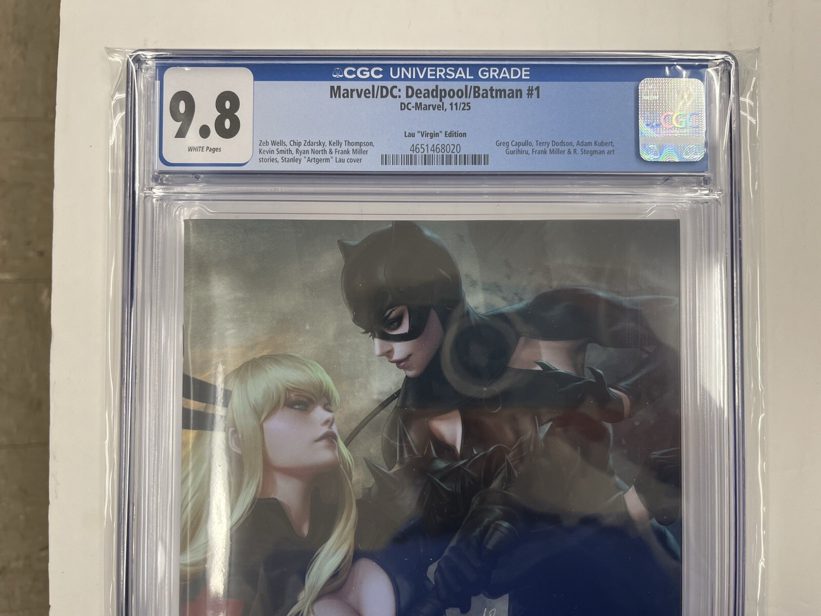 Grade: 9.8 Near Mint/Mint Marvel/dc: deadpool/batman #1 artgerm virgin variant[1:100]comic script by: zeb wells, kevin smithillustrated by: greg capullo, adam kubertcover design or artwork by: stanley "artgerm" lau ... Read More