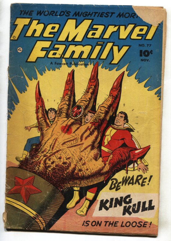 Grade: GMarvel Family #77 1952-Communist threat cover-comic book King Kull appearance., Communist threat cover. Otto Binder story, Kurt Schaffenberger art . Piece off cover, centerfold loose from staples. Complete, no restoration. Grade: G SKU: DHV-08-397