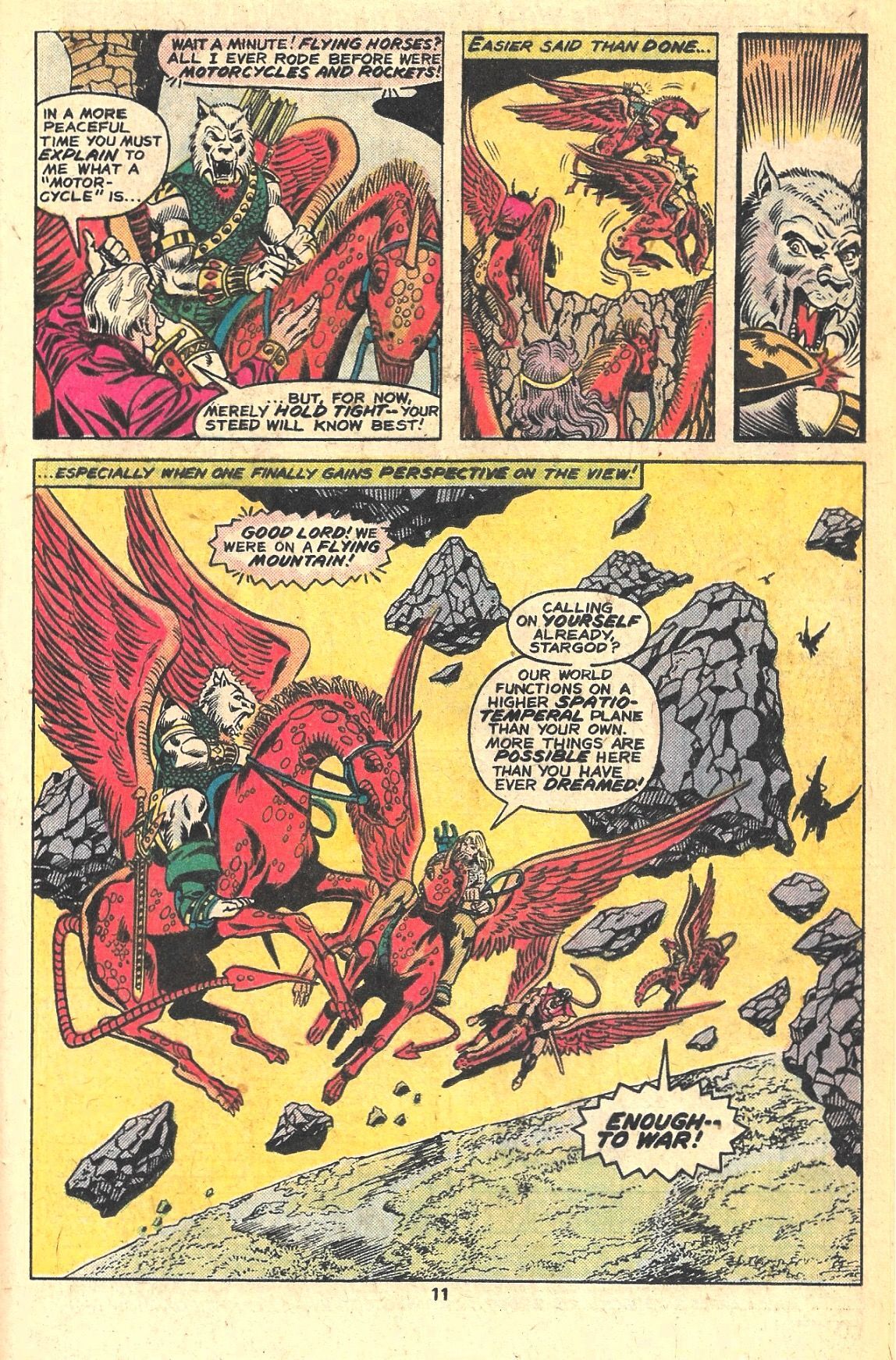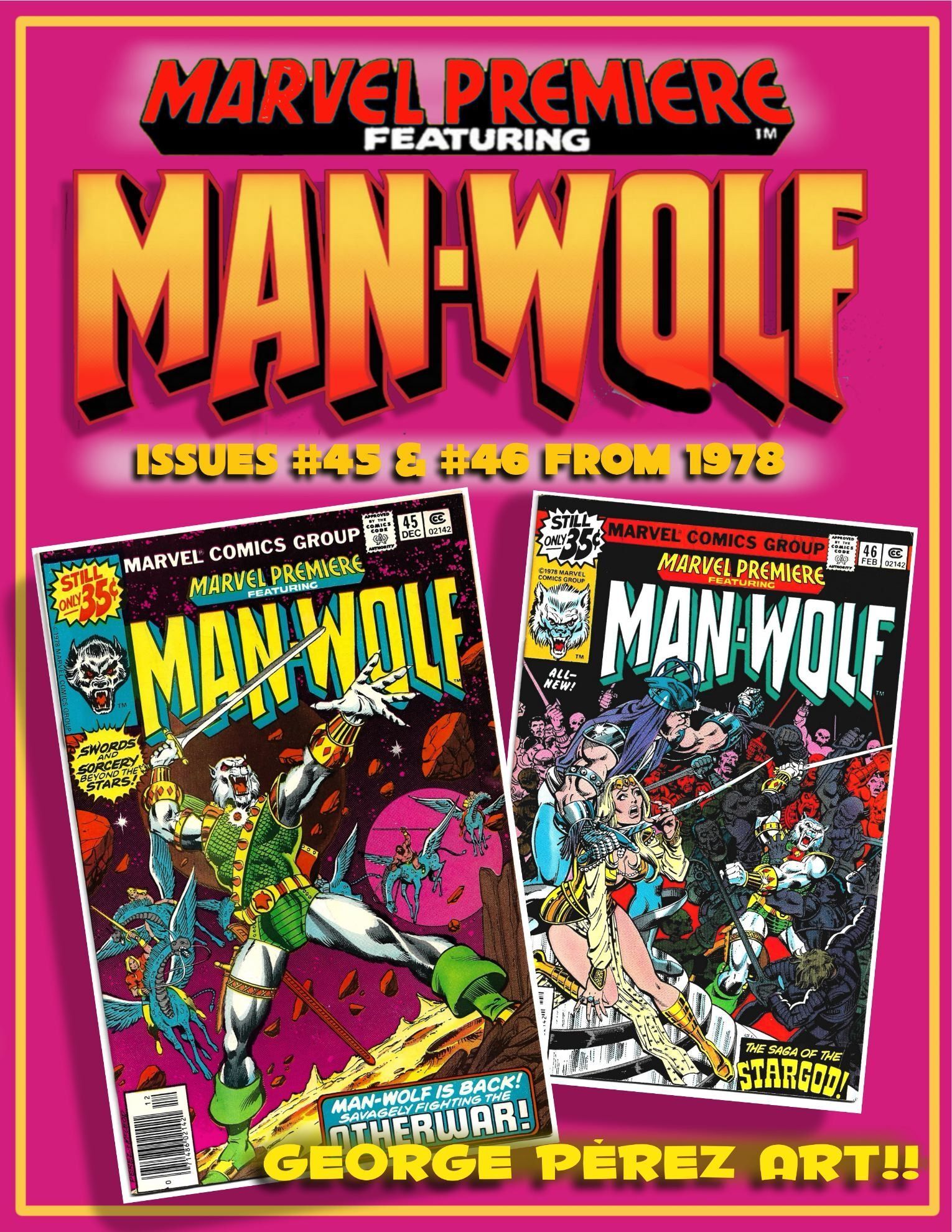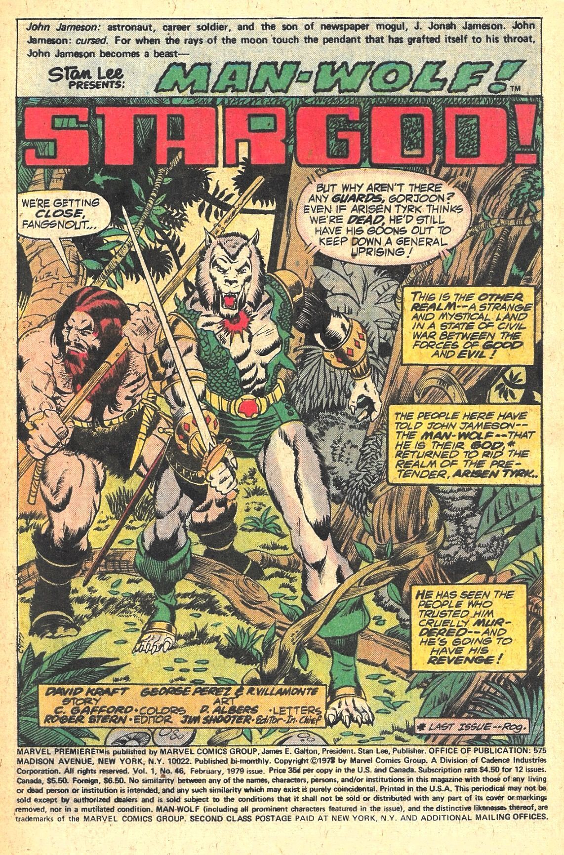 Here in MARVEL PREMIERE #45 and 46 he was put forward as a tragic and complex character with violent lycanthropic tendencies! These two issues, written by David Anthony Kraft and illustrated by the late, great George Pérez, introduce the OTHER REALM, a world in outer space of sword and sorcery, as well as a retelling of the origin of MAN-WOLF and how he relates to STAR-GOD, the ruler of OTHER REALM.