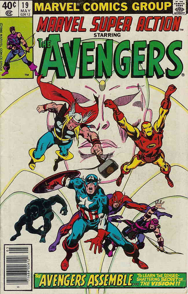 Item: Marvel Super Action #19 (Newsstand) | Publisher: Marvel | Cover Date: May 1980 | Writer: Roy Thomas | Artist: John Buscema | Cover Artist: John Buscema | Appearances: Avengers, Black Panther (T’Challa), Hawkeye (Clint Barton), Goliath (Hank Pym), Wasp, Thor (Don Blake), Captain America (Steve Rogers), Iron Man (Tony Stark), Vision II, Ultron, Wonder Man | Storylines: Avengers: Even an Android Can Cry | Notes: Reprints Avengers #58; newsstand edition | With Economy shipping, each additional comic ships for just 50 cents more to customers in the USA. This listing contains a stock photo and information from ComicBase™ and © Human Computing. The stock photo is for reference only. If you would like to see a photo of the actual item, please message us prior to purchasing.Seller Information