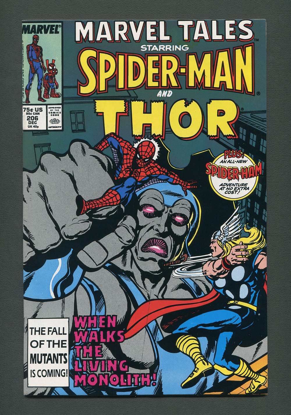 Cover pencils by John Byrne. Whom Gods Destroy!, script by Chris Claremont, pencils by John Byrne, inks by Tony DeZuniga; Spidey battles the Living Monolith; Havok and Thor guest-star; reprinted from Marvel Team-Up (Marvel, 1972 series) #70. TV or not TV [Read a Good Book Lately? Part 2] starring Peter Porker and the Hunch-Razorback of Notre Dame, The Spectacular Spider-Ham, script by Michael Eury, pencils by Ron Zalme, inks by Pierre Fournier. (PC9)