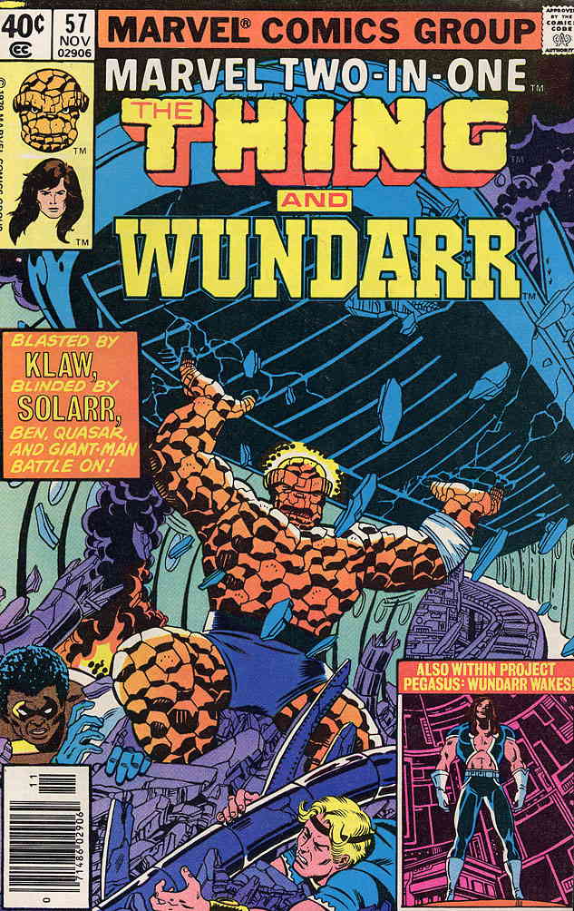 Item: Marvel Two-In-One #57 | Publisher: Marvel | Cover Date: November 1979 | Writer: Mark Gruenwald, Ralph Macchio | Artist: George Pérez | Cover Artist: George Pérez | Appearances: Wundarr, Quasar, Giant-Man (Bill Foster), Thundra, Solarr, Klaw, Thing (Ben Grimm) | Storylines: The Pegasus Project, Part 5; When Walks Wundarr! | Notes: Wundarr | With Economy shipping, each additional comic ships for just 50 cents more to customers in the USA. This listing contains a stock photo and information from ComicBase™ and © Human Computing. The stock photo is for reference only. If you would like to see a photo of the actual item, please message us prior to purchasing.Seller Information