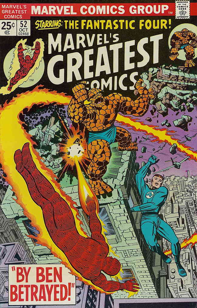 Item: Marvel's Greatest Comics #52 | Publisher: Marvel | Cover Date: October 1974 | Writer: Stan Lee | Artist: Jack Kirby | Appearances: Fantastic Four, Mr. Fantastic (Reed Richards), Invisible Girl (Sue Richards), Human Torch (Johnny Storm), Thing (Ben Grimm) | Storylines: By Ben Betrayed! | Notes: Reprinted from Fantastic Four #69 | With Economy shipping, each additional comic ships for just 50 cents more to customers in the USA. This listing contains a stock photo and information from ComicBase™ and © Human Computing. The stock photo is for reference only. If you would like to see a photo of the actual item, please message us prior to purchasing.Seller Information