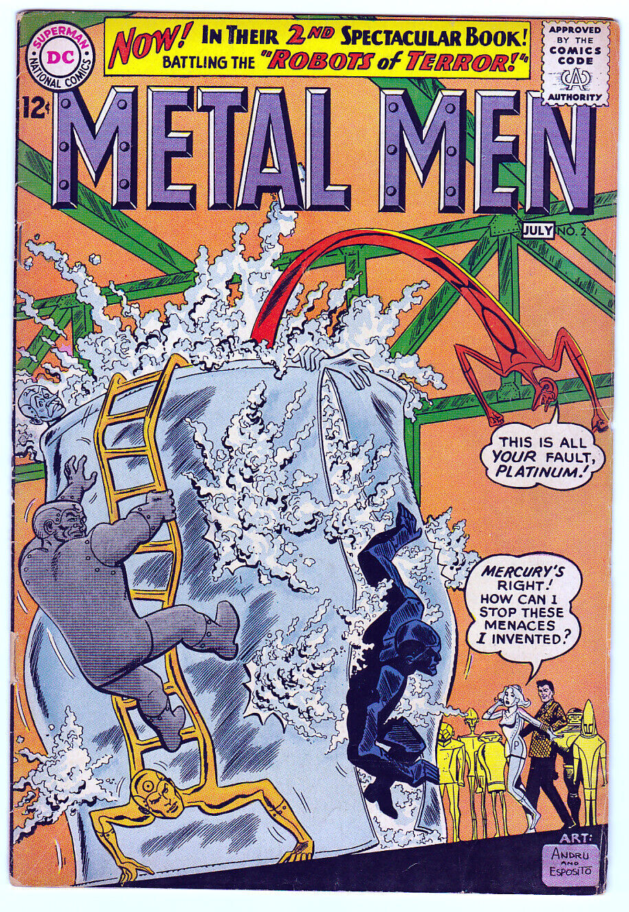 METAL MEN #2-SILVER AGE-DC-ANDRU-ESPOSITO Great issue of this classic SILVER AGE title. Bottom staple popped. Water stain back cover. 1963 Grade: VG- SKU: LI-07-350