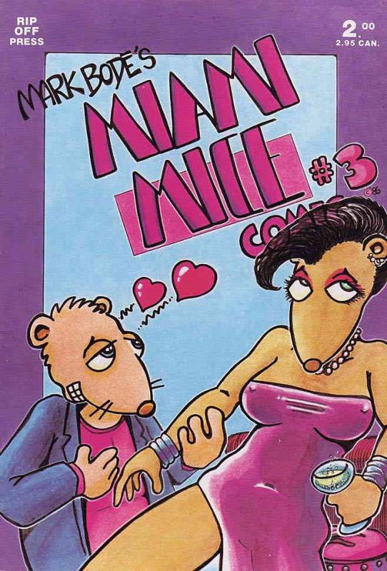 Item: Miami Mice #3 | Publisher: Rip Off | Cover Date: October 1986 | Writer: Larry S. Todd, Mark Bodé | Artist: Mark Bodé, Bill Fitts | Cover Artist: Mark Bodé | Storylines: Pie in Der’ Sky | Notes: B&W | With Economy shipping, each additional comic ships for just 50 cents more to customers in the USA. This listing contains a stock photo and information from ComicBase™ and © Human Computing. The stock photo is for reference only. If you would like to see a photo of the actual item, please message us prior to purchasing.Seller Information
