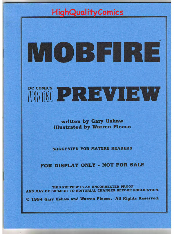 Condition: See more info in our description area....MOBFIRE Black and White Promo, William Pleece, 1994, VF/NM, Preview, more in MOBFIRE Black & White Promo.......{S t o c kp h o to}... Name of Promo Poster/Title?: MOBFIRE Black & White Promo.... Publisher: DC Comics.... Art by/Featuring/Stories?: Promo for a MOBFIRE comic with around 12 pages....Written by : Gary Ushaw...Art by : Warren Pleece... Grade of item? : This promo item is in VERY FINE / NEAR MINT (comic terms) condition.... Created when? : 1994.... Overall description : As new, with light handling wear and the staples showing a hint of rust.... 1st Printing... ...Lots more PROMO , POSTERS, FLYERS, ASHCANS, Warren Pleece, VERTIGO & HARD TO FIND items in our store. Be sure to check out all of our current on-going auctions! Lots of great product at affordable prices! Bookmark our listings with (control + D). Lots more coming in the next few weeks... Check out the scan(s). If you like this? Our store name is HighQualityComics...aka HQComics... We have been doing mail-order since 1988. We guarantee Absolute Satisfaction on All Orders! Shipping in a box. Combine auctions to save on postage. INTERNATIONAL CUSTOMERS : Email us for international shipping rates & acceptable ways to pay. INTERNATIONAL CUSTOMERS : Email us for acceptable ways to pay and shipping options, before you place an order. Thanks! This listing created with GLETech Multiple Selling Channel tools.