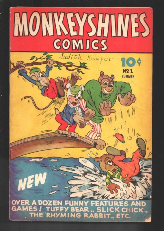 Grade: VG-Monkeyshines Issue: 1 / Year: 1944 Condition: VG--First issue -Slick Chick-fireworks story -Nutty Squirrel-Fox & Crow -Marmaduke Monk & more -Puzzle pages -Name written on cover -WWII era issue Publisher: AceSku: EB-12-123 Over 100,000 mail orders processed! Buy with confidence. Track Page Views WithAuctiva's Counter